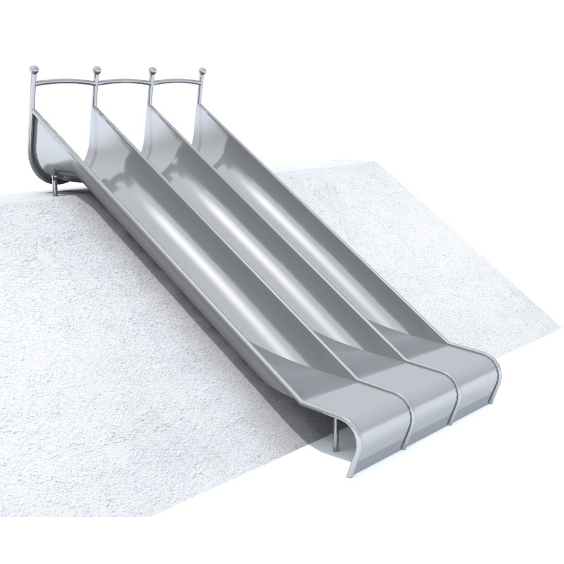 Gliti H1350 släntrutschkana med tre parallella trågformade rutschbanor. Stöds av nio fundamentben i rostfritt stål för hög stabilitet och hållbarhet. Tillverkad i rostfritt stål AISI 304 (1.4301), 2 mm plåttjocklek och profil 33,7 × 2 mm. Polerad och lättskött yta.