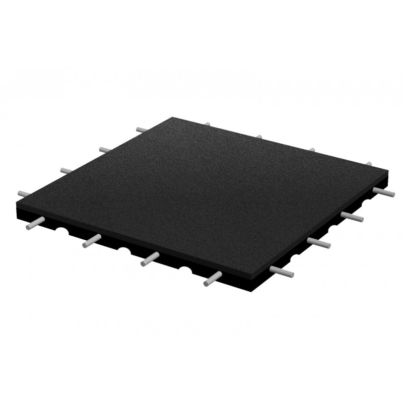 SBR-baserad säkerhetsplatta i format 500×500 mm med 30 mm tjocklek och fallhöjd upp till 1,1 m. Monteras utan lim på stabil grund och kopplas samman med installationsstift som ingår.