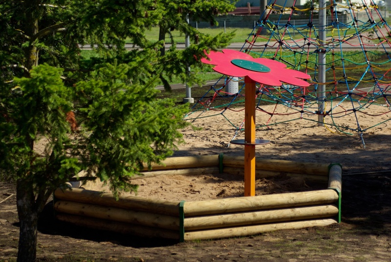 Sandlådeskugga BLOMMA som ger skydd mot både solens strålar och regn. Det runda bordet runt stolpen fungerar som avställningsyta för leksaker eller sandkreationer. Stolpen i laminerat trä är nedgjuten i betong och fäst med varmförzinkade beslag.