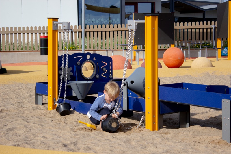 Stort sandlekkomplex med många funktioner som uppmuntrar utforskande, samarbete och sensorisk lek hos små barn.