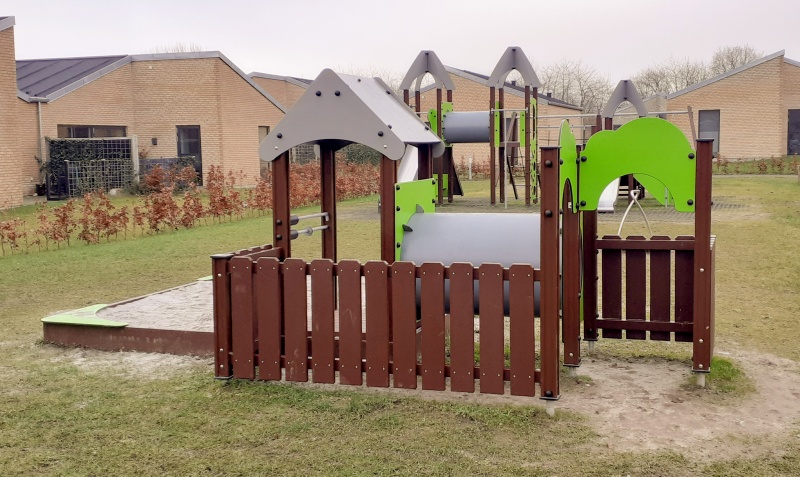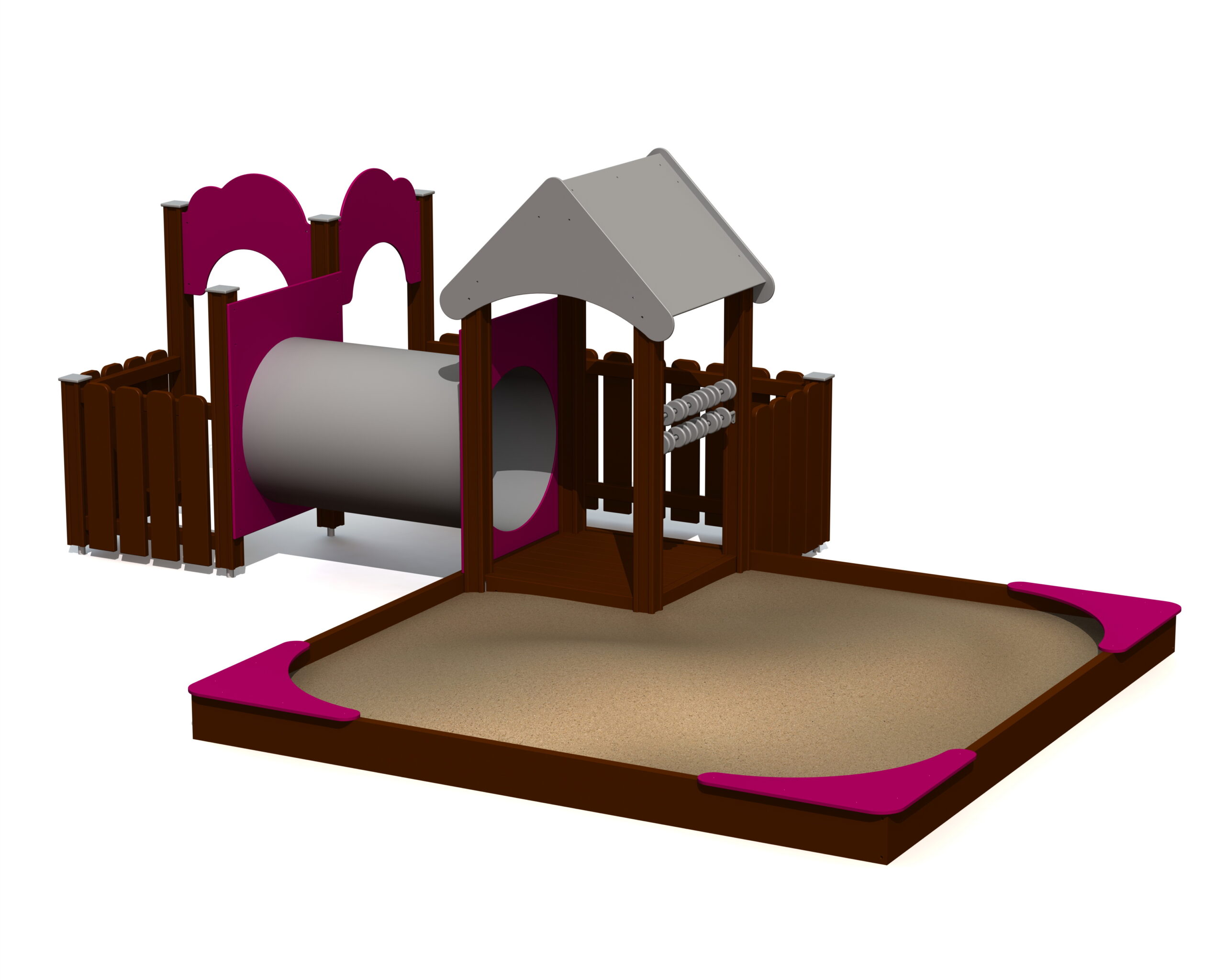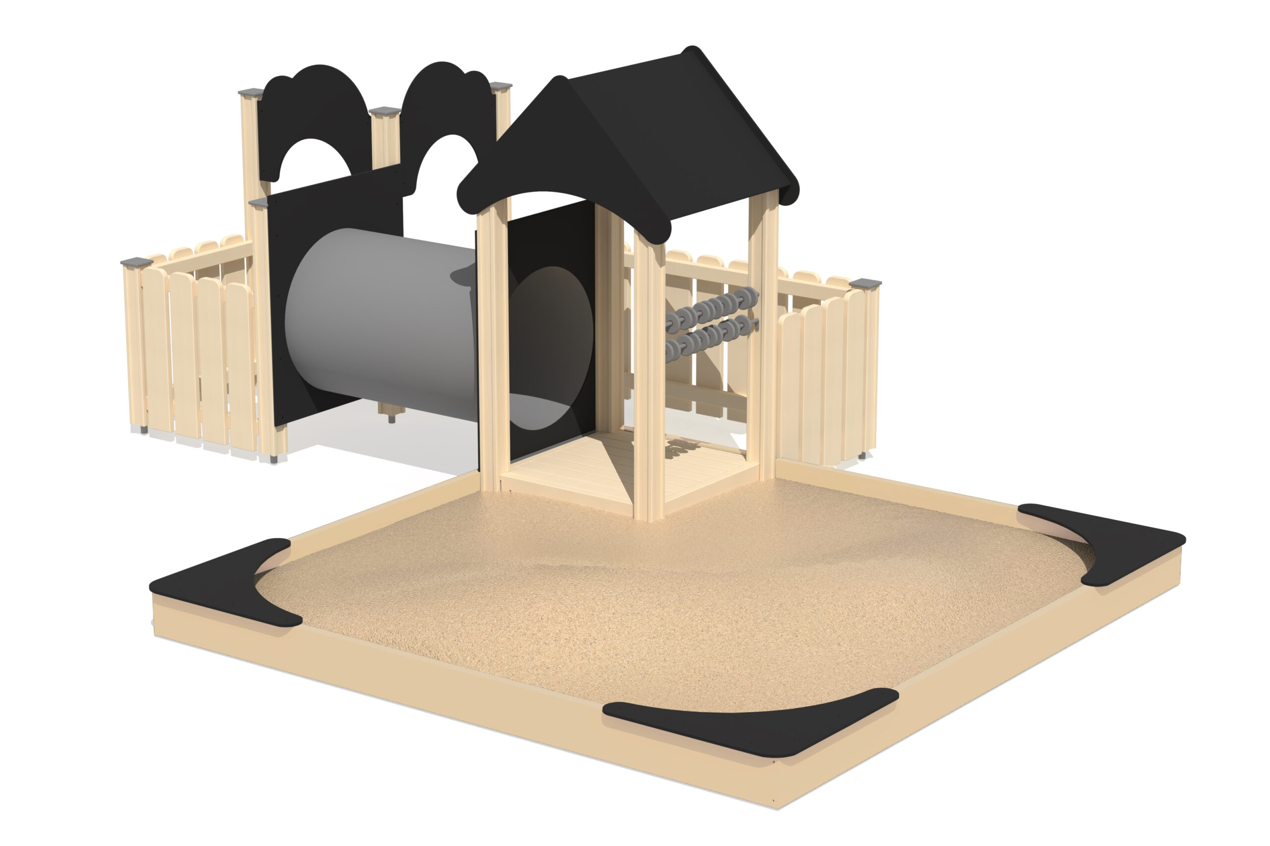 Lekcenterset med sandlåda i laminerat trä och integrerad lekstuga. Sandlådan har tre färgglada hörnplattor i HDPE som ger extra ytor för sandlek och förvaring. Lekstugan med tak skyddar mot sol och regn och uppmuntrar rollspel och kreativitet. Kulram, kryptunnel och lekytor ger variation i leken. Levereras med foder som hindrar jordblandning och ogräs. Nätskydd kan beställas. Sandlådan levereras utan sand.