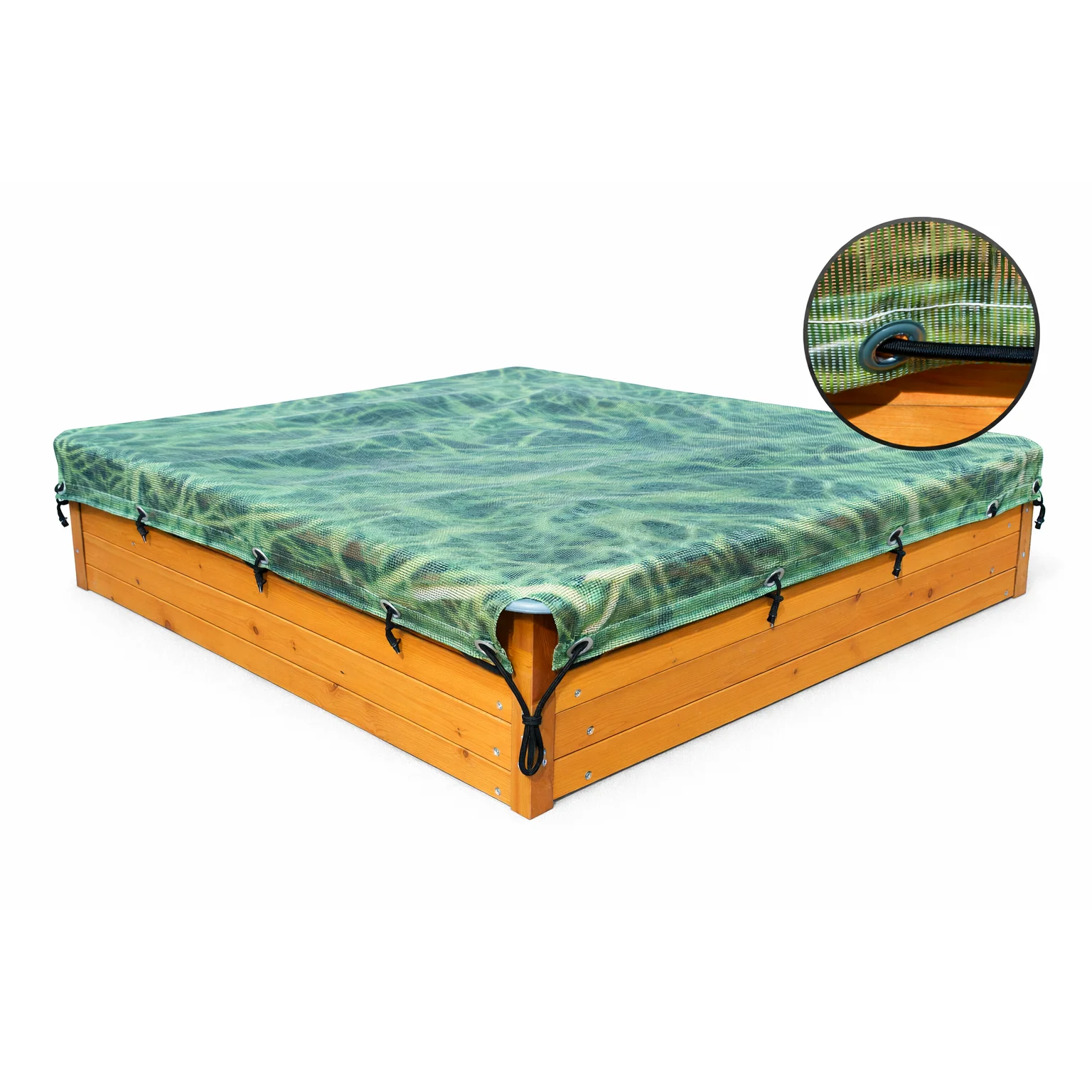 Sandlådeskydd tillverkat av höghållfast PVC-nätmaterial för utomhusbruk. Skyddet håller djur borta från sanden och minskar risken för mögel. Ett kraftigt gummisnöre löper genom metallöglor i kanterna och håller skyddet säkert på plats. Materialet är mycket långlivat och motståndskraftigt mot mekanisk påverkan. Tekniska data: vikt 250 g/m², rivhållfasthet 250 N/5 cm, draghållfasthet 900 N/5 cm. Tryckt gräsimitation med möjlighet till specialtryck. Anpassade storlekar kan tillverkas.