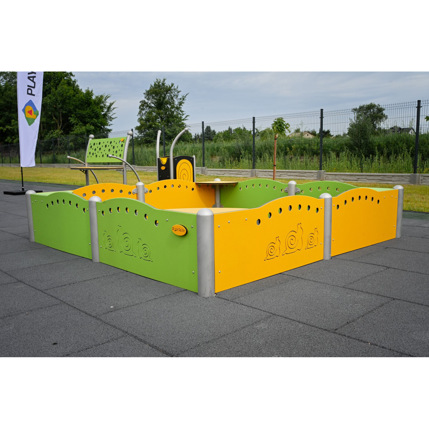 Rymlig sandlåda med färgstark design som uppmuntrar social och kreativ sandlek.