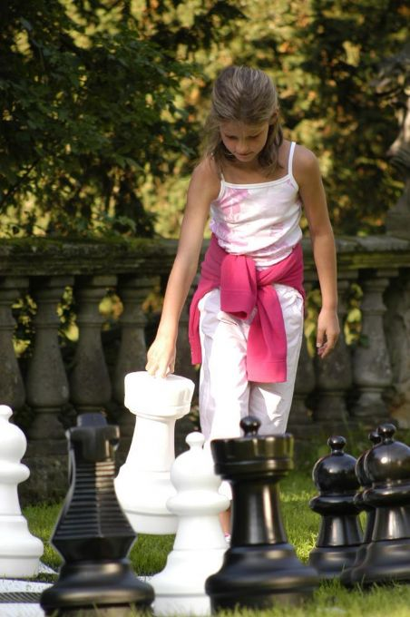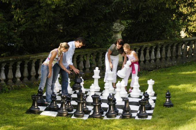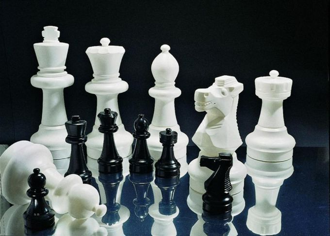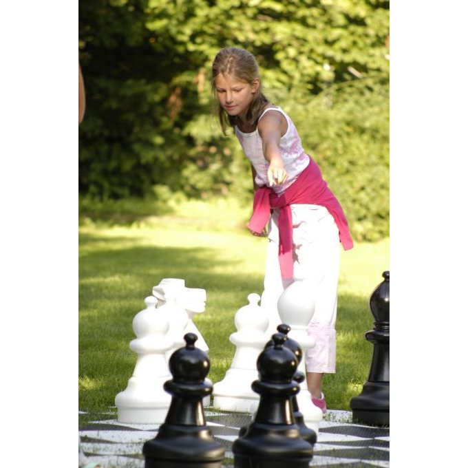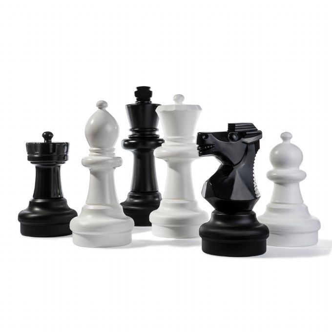 Schackpjäser i stort format som gör schackspelet mer interaktivt och tillgängligt för både barn och vuxna. Pjäsernas höjd varierar mellan cirka 43 och 64 cm, där kungen mäter cirka 64 cm, drottningen 58 cm, löpare och häst cirka 56 respektive 48 cm samt torn och bönder cirka 43 cm. Pjäserna kan fyllas med vatten eller sand för ökad stabilitet och lämpar sig för både inom- och utomhusbruk. Produktmått cirka 64 x 24 x 24 cm, levereras i två kartonger med total vikt omkring 16 kg.