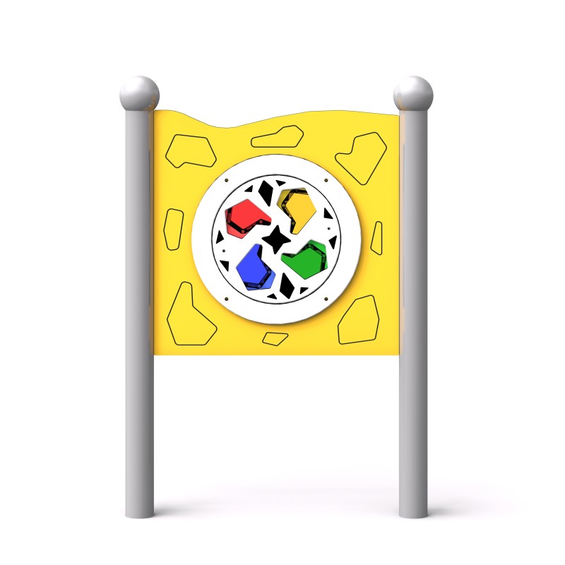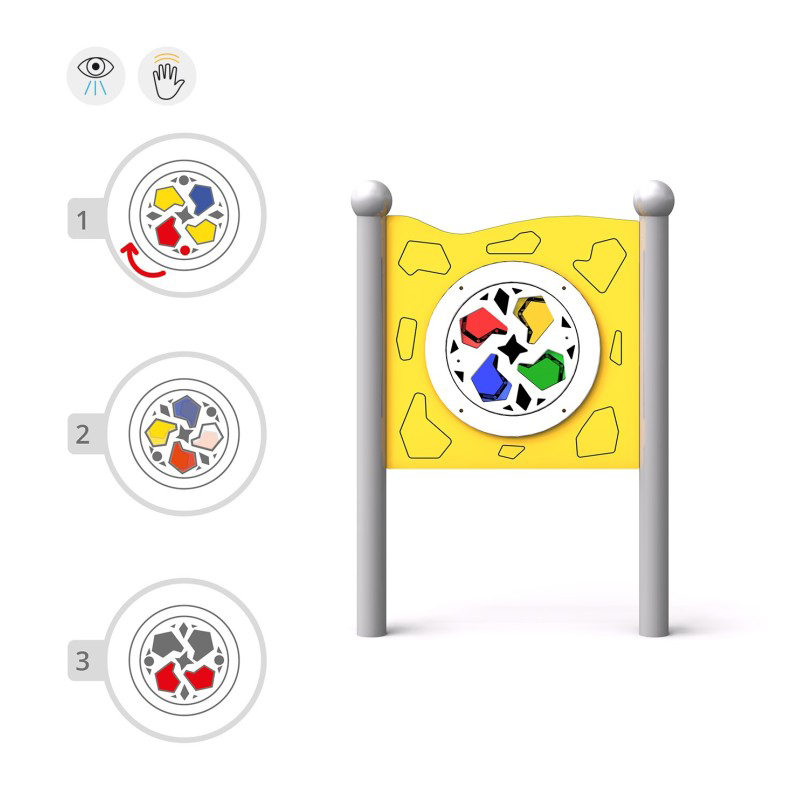Sensorisk bräda med ett snabbt roterande hjul utrustat med fyra färgglada kalejdoskopliknande fönster som ger en fascinerande visuell och taktil upplevelse. Konstruktionen är gjord av pulverlackerat svart stål och panelen av HDPE-plast. Stolparna avslutas med sfäriska dekorativa element. Brädan stimulerar syn, motorik och fantasi. Kan monteras på vägg med särskilda fästen. Finns i grön, gul, röd och blå.