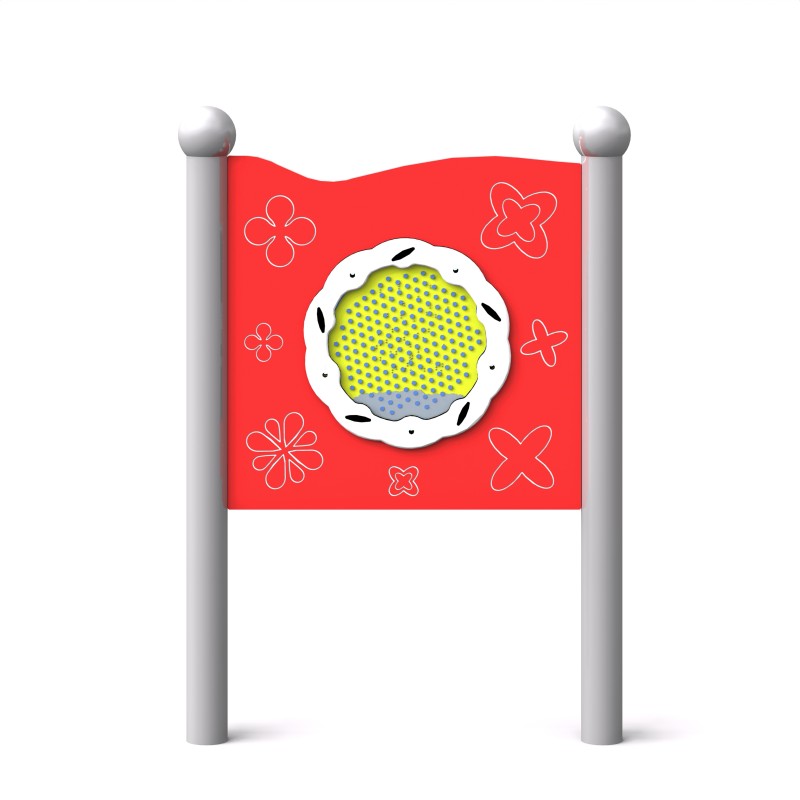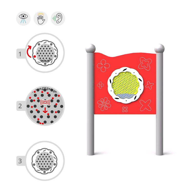 Sensorisk tavla där rostfria kulor tumlar genom stift när panelen snurras och skapar ett behagligt ljud. Anpassad för barn i rullstol och utformad för sensorisk stimulans, motorik och lekglädje. Konstruktionen är tillverkad av pulverlackerat svart stål. Panelen är gjord av HDPE-plast och stolparna avslutas med sfäriska dekorativa element. Kan även monteras på vägg. Finns i färgerna grön, gul, röd och blå.