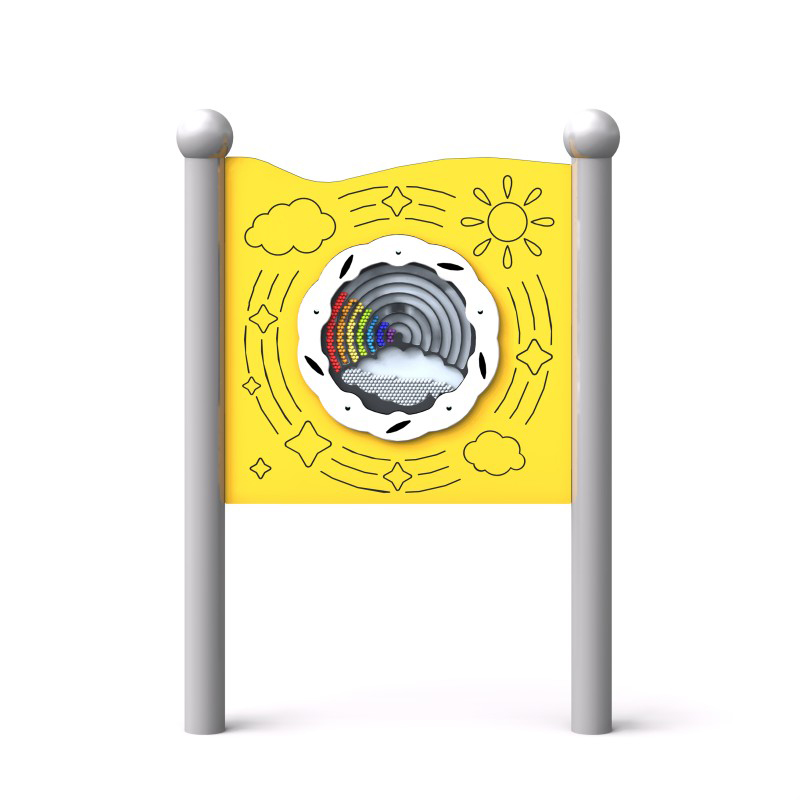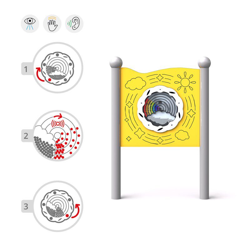 Sensorisk bräda med ett lättroterat hjul dekorerat med hundratals UV-stabila plastkulor i regnbågs- och molnfärger. Konstruktionen är gjord av pulverlackerat svart stål och panelen av HDPE-plast, lämpad för intensiv utomhusanvändning. Stolparna avslutas med sfäriska dekorativa element. Brädan stimulerar syn, motorik och kreativitet i en inkluderande miljö. Kan även monteras på vägg med särskilda fästen. Finns i grön, gul, röd och blå.