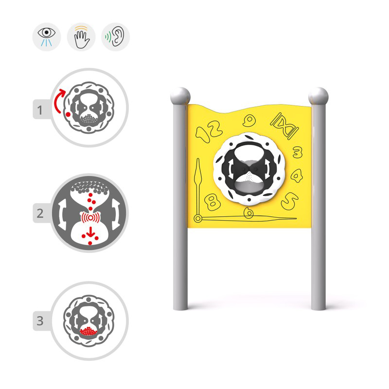Sensorisk bräda med tusentals små kulor i rostfritt stål som faller från topp till botten och skapar en visuell och taktil upplevelse. Brädan är även utrustad med ett roterande timglas som kan ställas in i 30-sekundersintervall. Konstruktionen är gjord av pulverlackerat svart stål och panelen av HDPE-plast. Stolparna avslutas med sfäriska dekorativa element. Kan monteras på vägg med särskilda fästen. Finns i grön, gul, röd och blå.