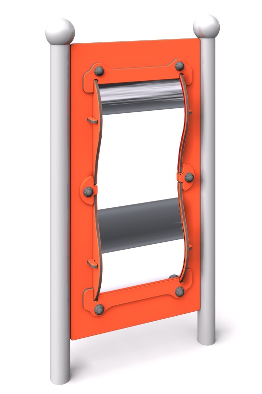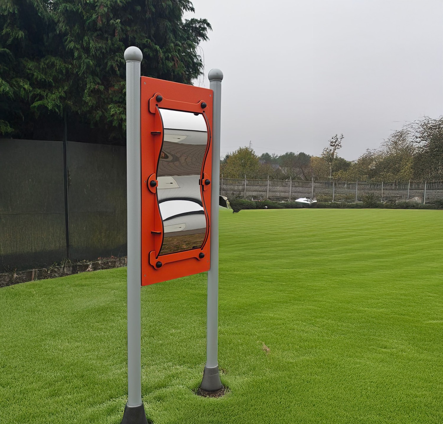 Sensorisk tavla för kreativ och inkluderande lek, anpassad för barn i rullstol. Tavlan är utrustad med en böjd, vågig spegel som förvränger spegelbilden och uppmuntrar till lek, interaktion och visuell utforskning. Produkten stödjer barnets sensoriska utveckling. Konstruktionen är tillverkad av svart, galvaniserat och pulverlackerat stål. Panelen är gjord av HDPE-plast och rören avslutas med sfäriska dekorativa element.