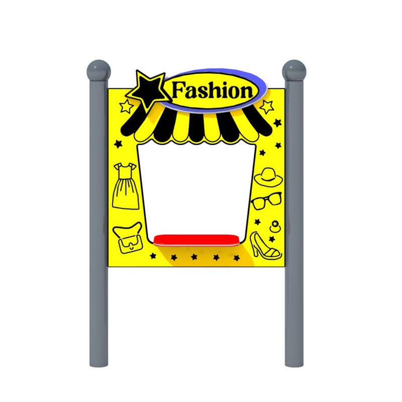 Utbildande och inkluderande tavla anpassad för barn i rullstol. Tavlan är utformad som en butiksdisk med texten Fashion och uppmuntrar till rolllek, social interaktion och kreativt lärande. Konstruktionen är tillverkad av svart, galvaniserat och pulverlackerat stål. Panelen är gjord av HDPE-material och rören avslutas med sfäriska dekorativa element.