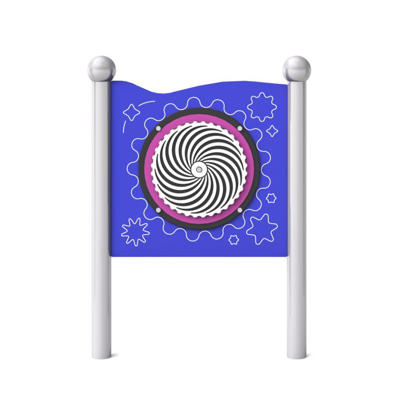 Sensorisk tavla för kreativ och inkluderande lek, anpassad även för barn i rullstol. Tavlan är utrustad med en roterande skiva med spiralmönster som fångar uppmärksamhet och stimulerar visuell perception. Det rörliga elementet uppmuntrar interaktion och stödjer barnets sensoriska utveckling. Konstruktionen är tillverkad av svart, galvaniserat och pulverlackerat stål. Panelen är gjord av HDPE-plast och stolparna avslutas med sfäriska dekorativa element.
