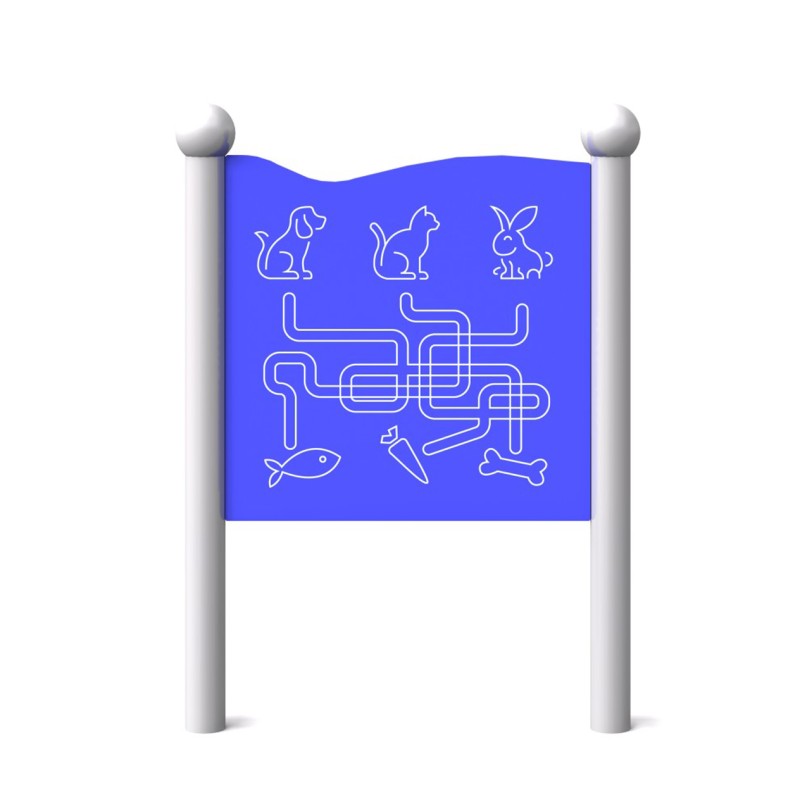 Utbildningstavla med snidat pedagogiskt spel där barn matchar djur med rätt föda. Anpassad för barn i rullstol och utformad för att stödja lärande och sensorisk utveckling. Konstruktionen är tillverkad av galvaniserat och pulverlackerat svart stål. Panelen är gjord av HDPE-plast med sfäriska dekorativa avslut.