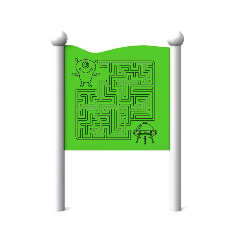 Utbildningstavla med snidat pedagogiskt spel där barn guidar en utomjording genom en labyrint till sitt rymdskepp. Anpassad för barn i rullstol och utformad för kreativ och sensorisk lek. Konstruktionen är tillverkad av galvaniserat och pulverlackerat svart stål. Panelen är gjord av HDPE-plast med sfäriska dekorativa avslut.
