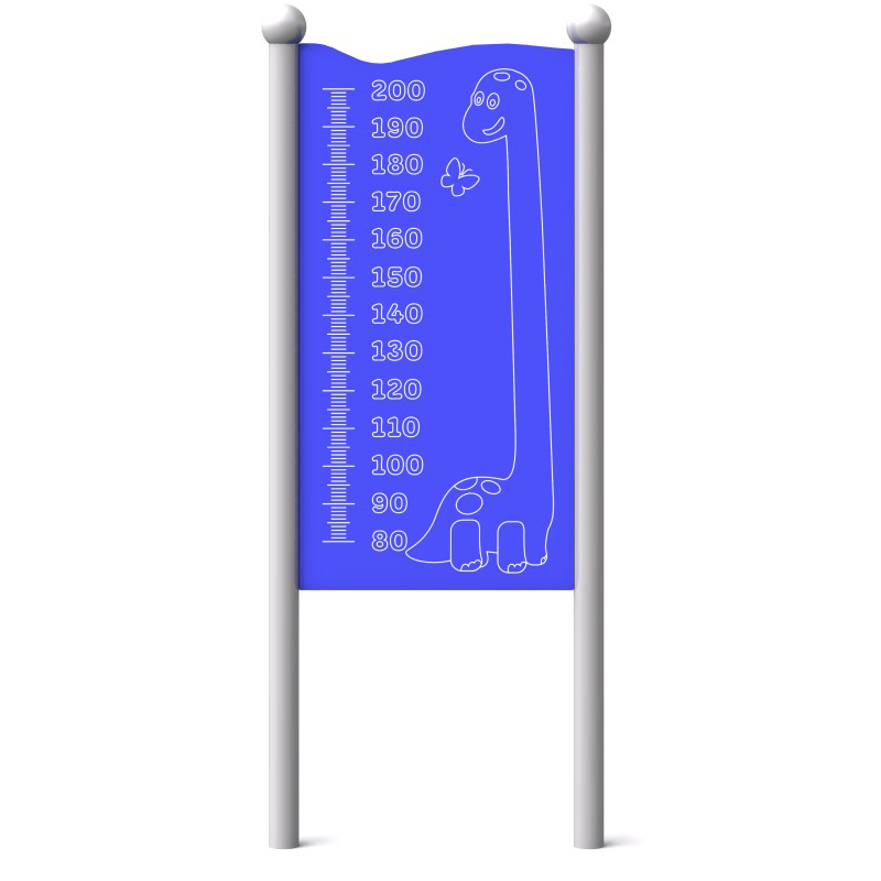Pedagogisk tavla för kreativ lek, anpassad för barn i rullstol. Tavlan har en dinosaurieutskärning samt en integrerad höjdmätningsskala i centimeter. Produkten stödjer lärande, motorik och sensorisk utveckling genom lek. Konstruktionen är tillverkad av svart stål som är galvaniserat och pulverlackerat. Panelen är gjord av HDPE-material och rören är avslutade med dekorativa sfäriska element.