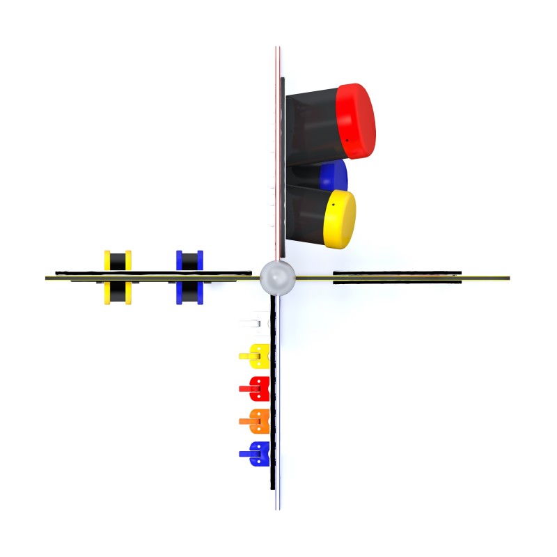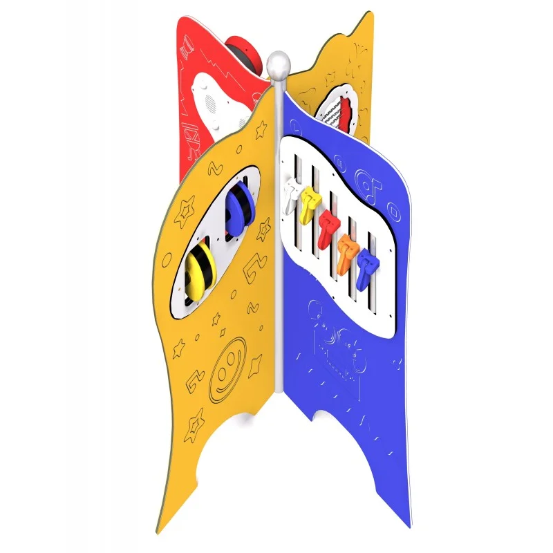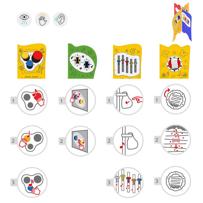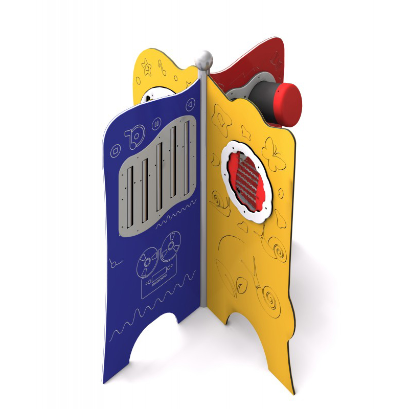 Fyrdubbel sensorisk tavla för kreativ och inkluderande lek. Tavlan har fyra paneler där färgglada roterande trummor skapar maracasljud, tubklockor och bongo möjliggör musikaliskt skapande samt ett snurrande hjul ger ett lugnande regnljud. Konstruktionen är tillverkad av pulverlackerat svart stål och panelerna av HDPE-plast. Stolparna avslutas med sfäriska dekorativa element. Finns i grön, gul, röd och blå.