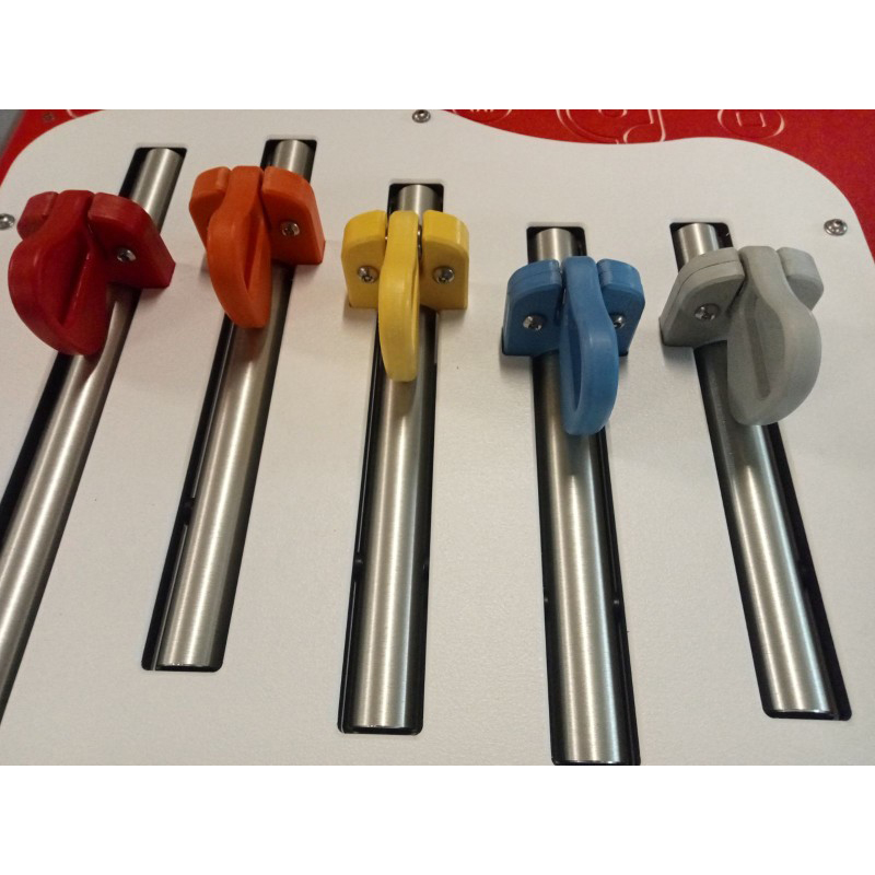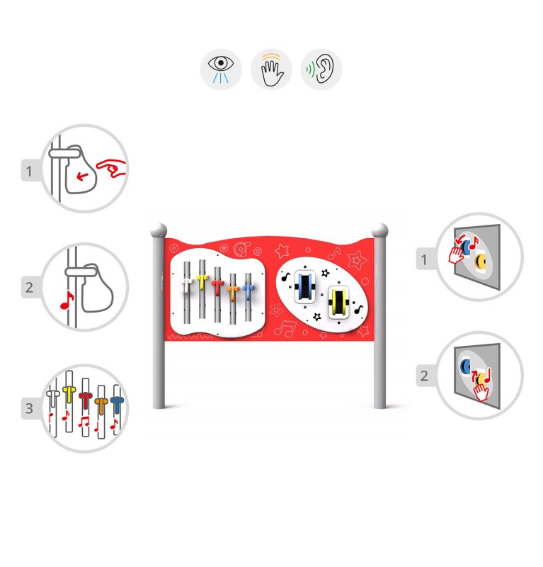 Dubbel sensorisk tavla med två paneler. Den första panelen har fem färgkodade rörklockor som kan spelas som ett musikinstrument. Den andra panelen innehåller två färgglada trummor som skapar maracasliknande ljud. Konstruktionen är tillverkad av pulverlackerat svart stål och panelerna av HDPE-plast. Stolparna avslutas med sfäriska dekorativa element. Kan monteras på vägg med särskilda fästen. Finns i grön, gul, röd och blå.