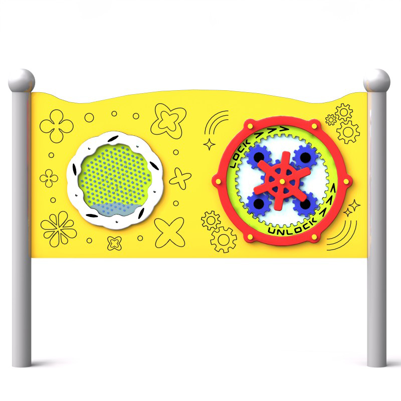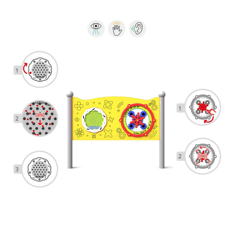 Dubbel sensorisk tavla för kreativ och inkluderande lek. Den ena panelen innehåller en snabbt roterande interaktiv panel med kugghjul, medan den andra består av rostfria kulor som tumlar genom stift när skivan snurras och skapar ett behagligt ljud. Konstruktionen är tillverkad av pulverlackerat svart stål och panelerna av HDPE-plast. Stolparna avslutas med sfäriska dekorativa element. Kan väggmonteras med särskilda fästen. Finns i grön, gul, röd och blå.