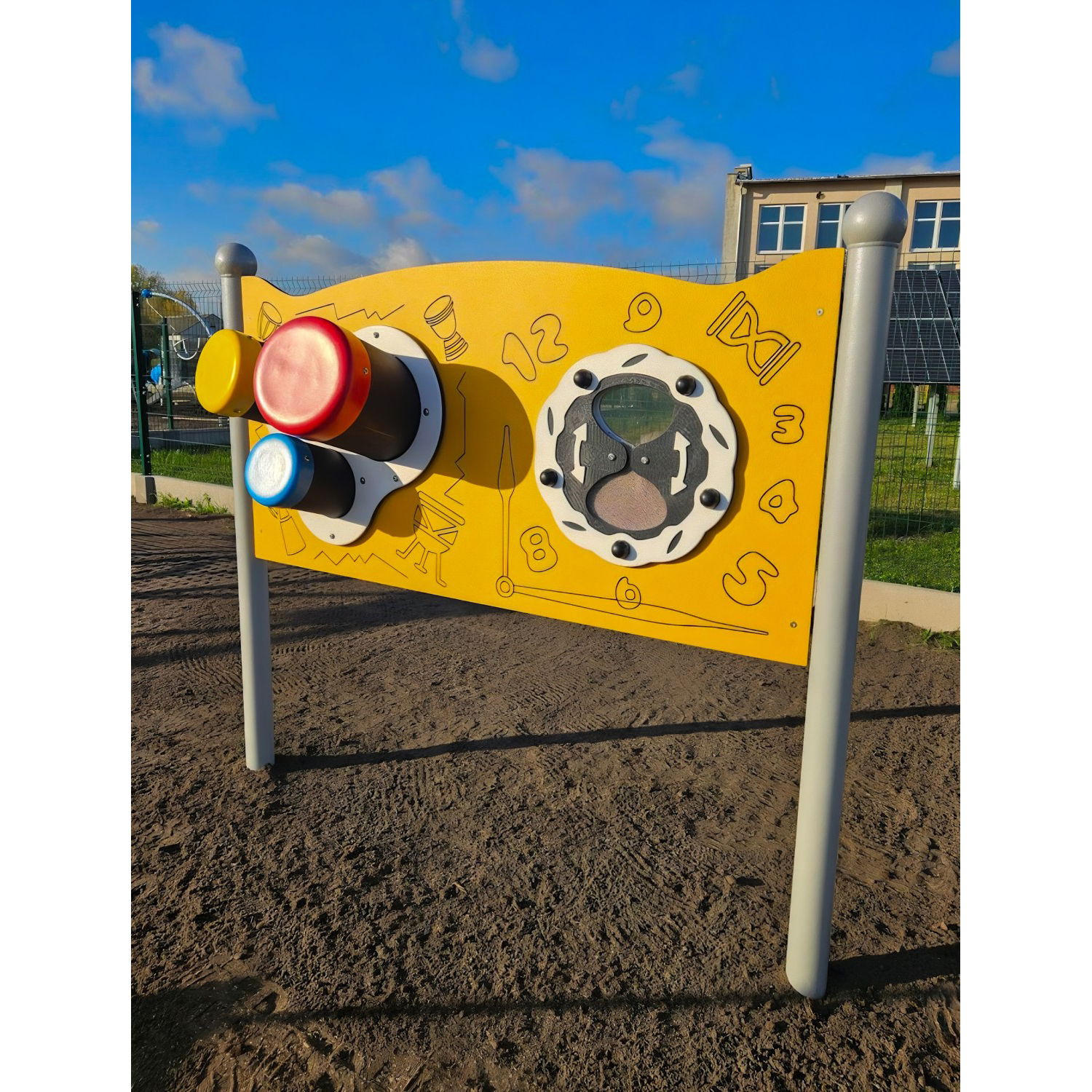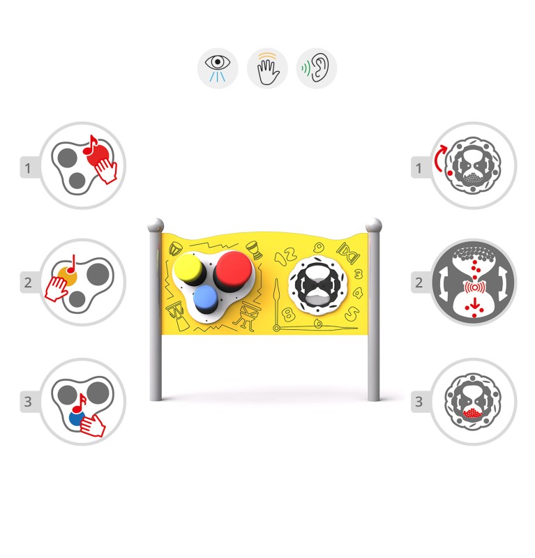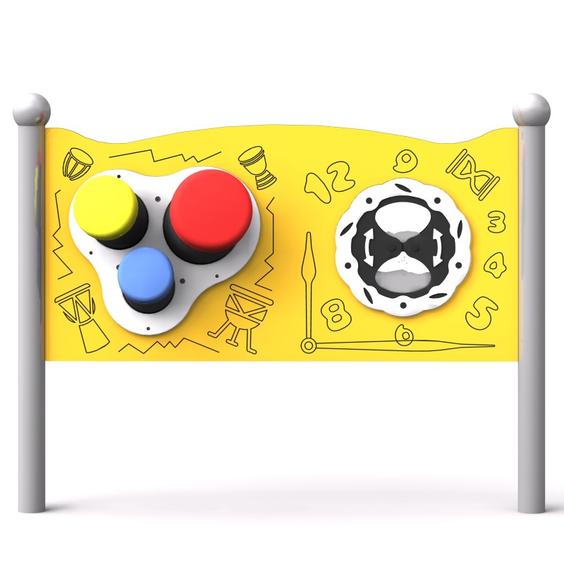 Dubbel sensorisk tavla med två paneler. Den första panelen har slitstarka bongos med hög ljudkvalitet. Den andra panelen innehåller tusentals små rostfria kulor som faller från topp till botten samt ett roterande timglas med 30-sekundersintervall. Konstruktionen är tillverkad av pulverlackerat svart stål och panelerna av HDPE-plast. Stolparna avslutas med sfäriska dekorativa element. Kan monteras på vägg med särskilda fästen. Finns i grön, gul, röd och blå.