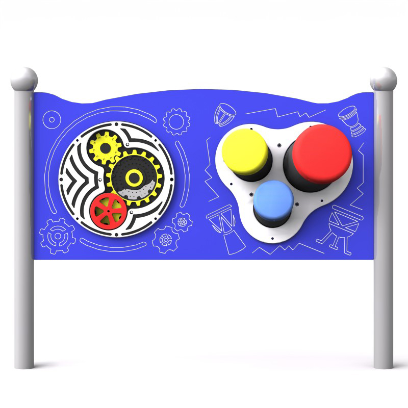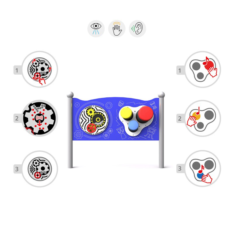 Dubbel sensorisk tavla med två paneler. Den första panelen innehåller slitstarka bongos med hög ljudkvalitet. Den andra panelen är utrustad med tre lättroterade kugghjul som kan flyttas i olika riktningar. Konstruktionen är gjord av pulverlackerat svart stål och panelerna av HDPE-plast. Stolparna avslutas med sfäriska dekorativa element. Kan monteras på vägg med särskilda fästen. Finns i grön, gul, röd och blå.