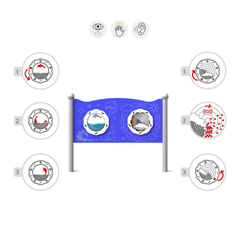 Dubbel sensorisk tavla med två paneler. Den ena panelen har ett snabbt roterande hjul med hundratals UV-stabila plastkulor i regnbågs- och molnfärger. Den andra panelen består av en roterande trumma med dykande och hoppande delfinmotiv och plastkulor. Konstruktionen är gjord av pulverlackerat svart stål och panelerna av HDPE-plast. Stolparna avslutas med sfäriska dekorativa element. Kan monteras på vägg med särskilda fästen. Finns i grön, gul, röd och blå.