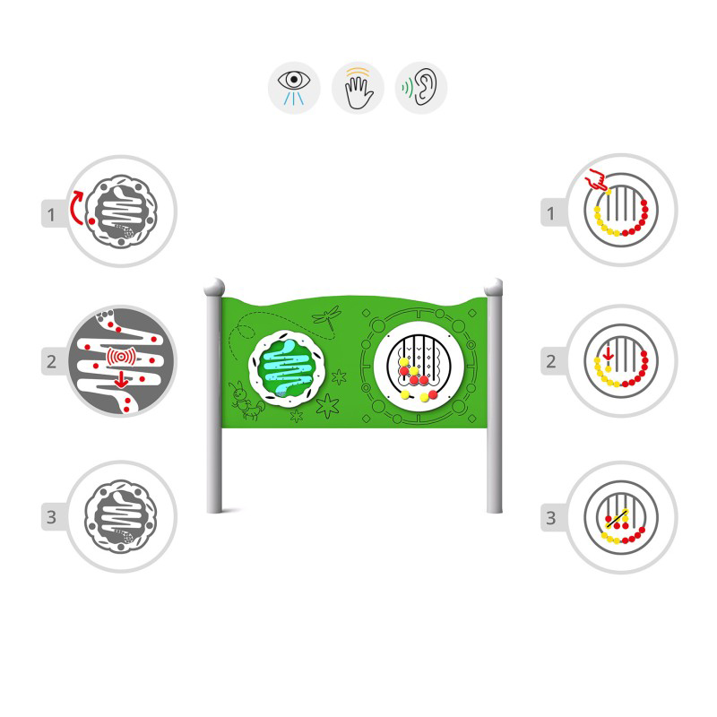 Dubbel sensorisk tavla för kreativ och inkluderande lek, anpassad även för barn i rullstol. Tavlan består av två paneler: en med ett snabbt roterande hjul där kulorna rör sig i takt med rotationen, samt en panel med runda element som kan föras längs förutbestämda spår i olika riktningar. Konstruktionen är tillverkad av pulverlackerat svart stål och panelerna av HDPE-plast, anpassad för intensiv utomhusanvändning. Stolparna avslutas med sfäriska dekorativa element. Tavlan stimulerar finmotorik, hand-öga-koordination och fantasi. Kan även väggmonteras med särskilda fästen. Finns i färgerna grön, gul, röd och blå.