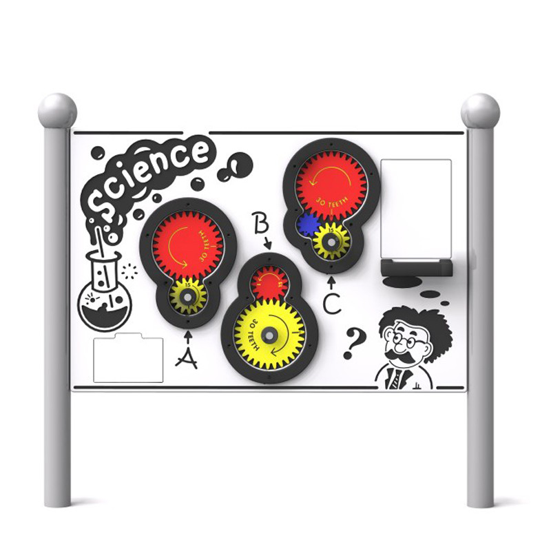 Utbildningstavla för kreativ lek och experiment, anpassad för barn i rullstol. Tavlan innehåller tre uppsättningar växlar med olika utväxlingar, en whiteboard för dokumentation samt tryckt information med experimentidéer. Konstruktionen är tillverkad av galvaniserat och pulverlackerat svart stål. Panelen är gjord av HDPE-plast med sfäriska dekorativa avslut.