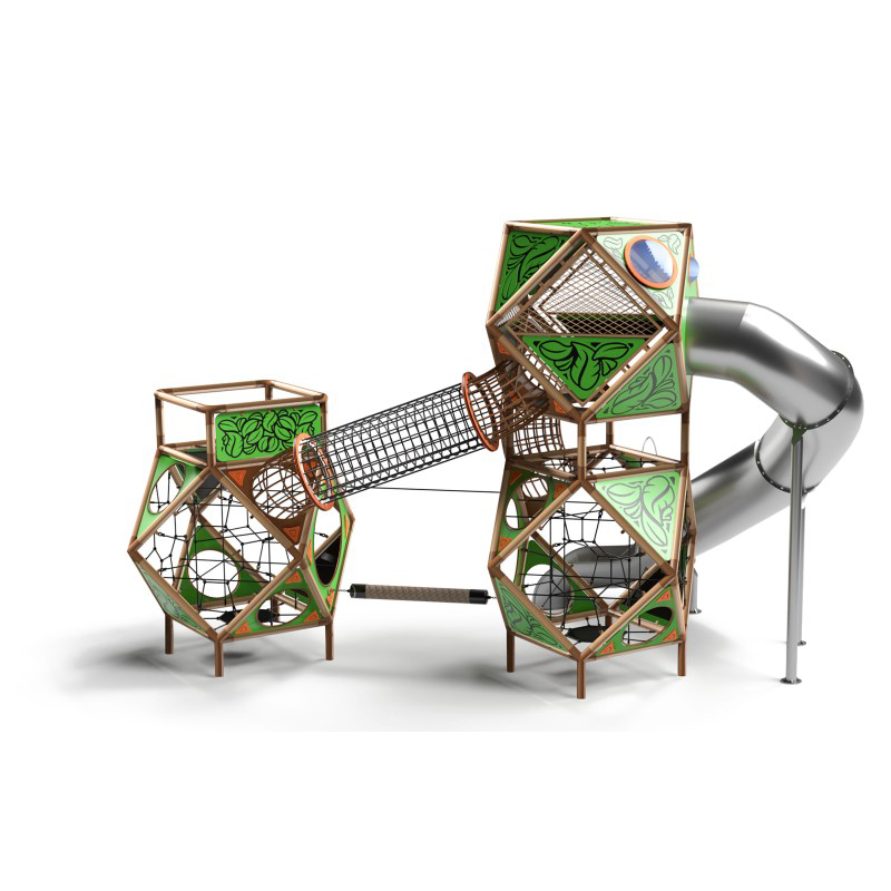 Sfero Skog 3-1 Lekställning är en lekplatsattraktion som kan bli mittpunkten på vilken lekplats som helst. Den imponerande strukturen med modern design och geometrisk precision drar uppmärksamhet på avstånd och väcker nyfikenhet. Lekställningen består av tre sammankopplade sfäriska moduler och en lång böjd rörslide. Varje sfär är en arkimedisk solid med åttakantig symmetri och liksidig radiell konstruktion, vilket ger mycket hög stabilitet och säkerhet. Varje modul innehåller 24 identiska kanter av konstruktionsstålrör Ø 88,9 mm med väggtjocklek 2,6 mm, varmförzinkade och pulverlackerade. Modulerna är sammankopplade med ett internt hylssystem som säkerställer full stabilitet även vid intensiv lek med upp till 39 barn. Valbar version med plastslid finns.