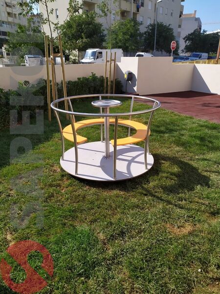 En populär karusell med rostfri konstruktion, halkfritt HPL-golv och rund HDPE-sits. Karusellen roterar via en mittplatta och har en fallhöjd under 1 meter, vilket gör att gräsyta räcker som underlag. Högkvalitativa material ger lång livslängd och lågt underhåll. Lämplig för lekplatser, skolor, parker och restaurangmiljöer. Certifierad enligt EN 1176-1 och EN 1176-5.