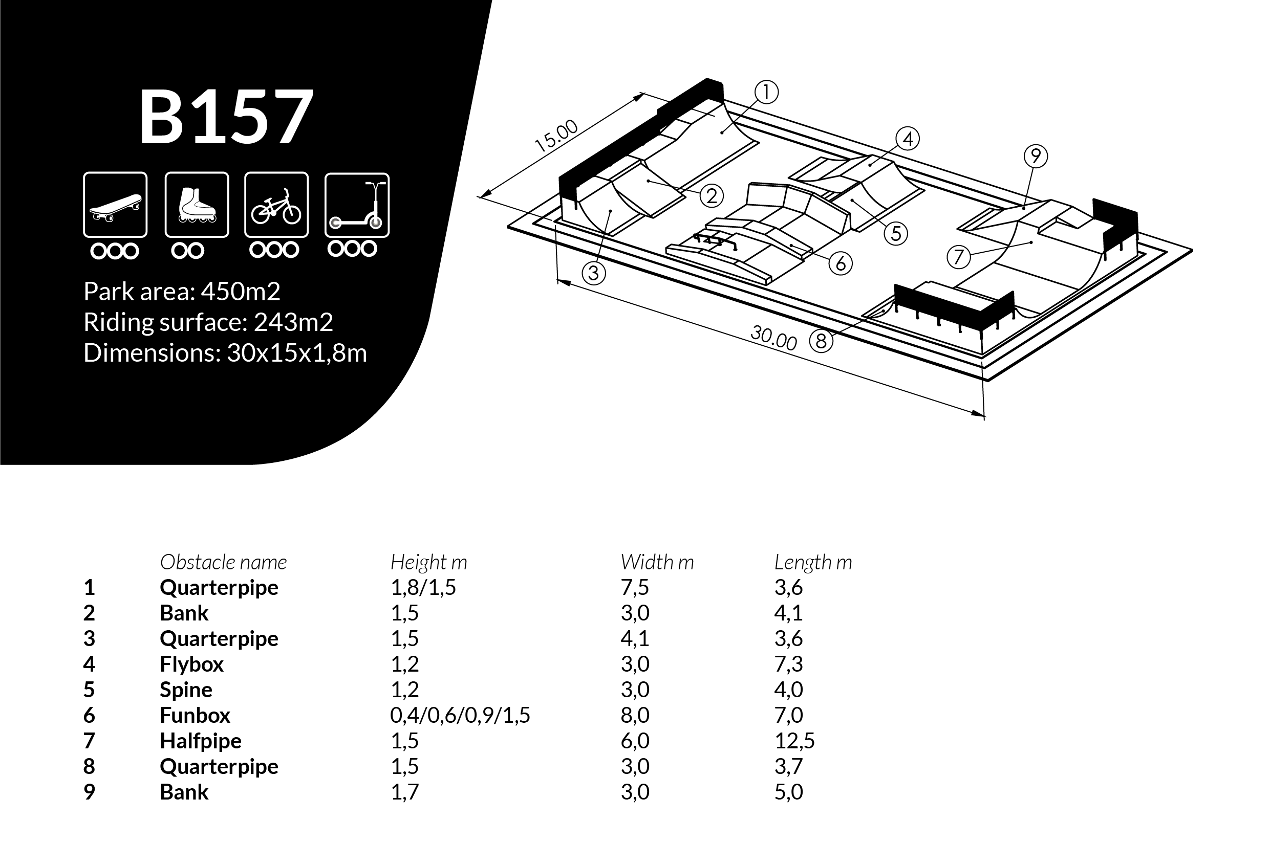 Skateboard Adina är utformad som skateparklösning för skateparker och offentliga aktivitetsytor. Mått: L 15 m, B 30 m, H 1,8 m.