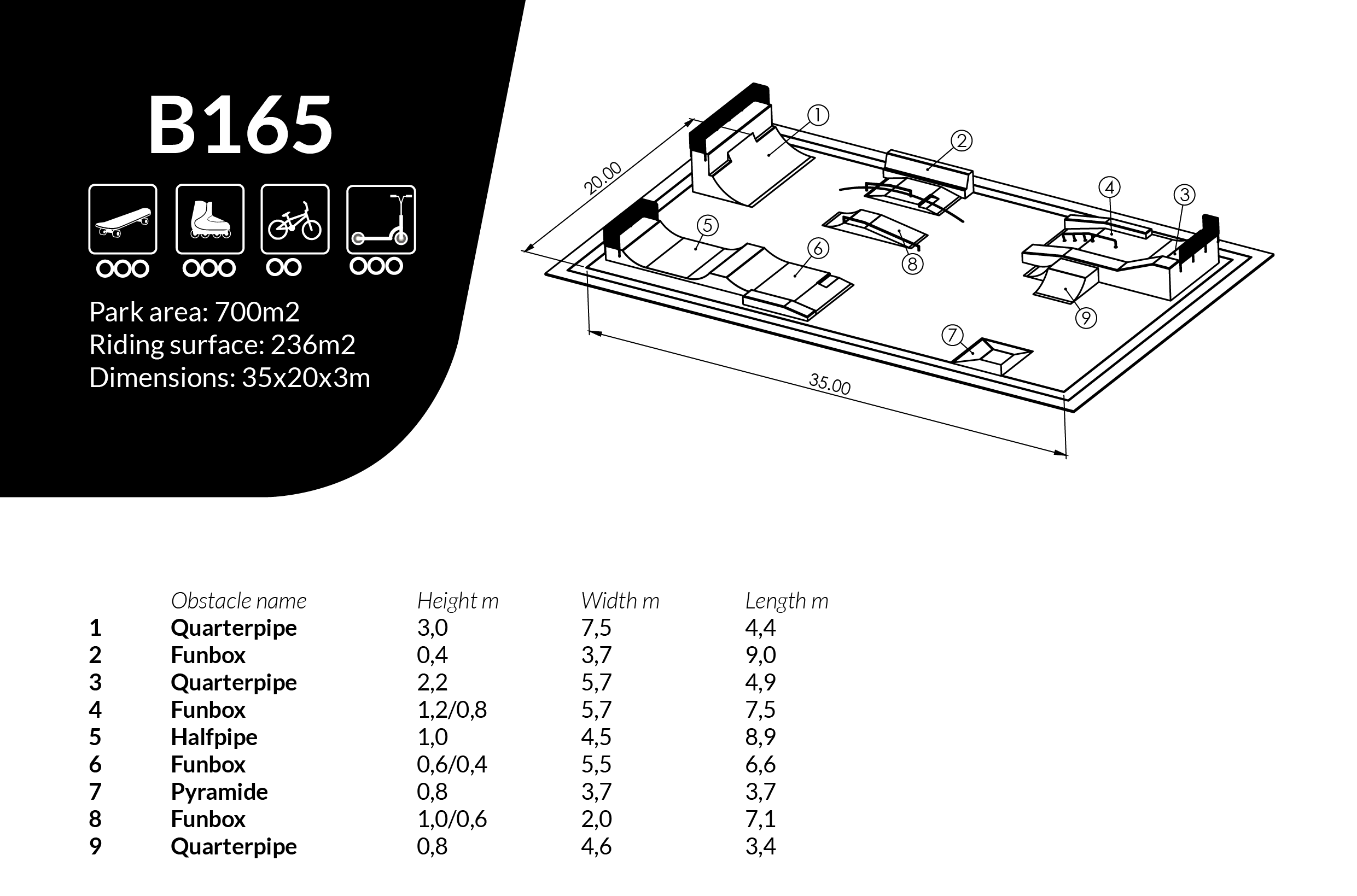 Skateboard Clara är utformad som skateparklösning för skateparker och offentliga aktivitetsytor. Mått: L 20 m, B 35 m, H 3 m.
