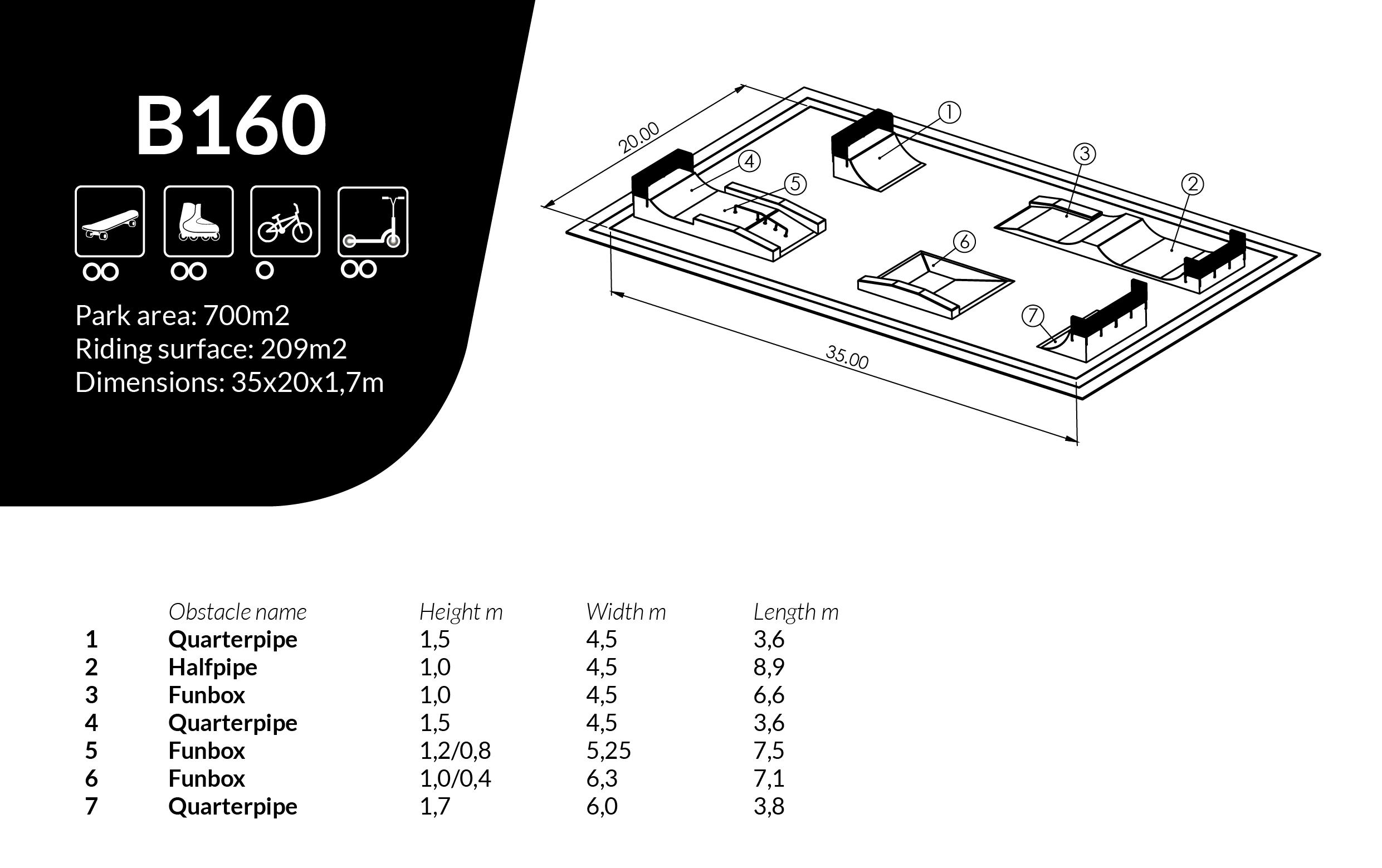 Skateboard Ebba är utformad som skateparklösning för skateparker och offentliga aktivitetsytor. Mått: L 20 m, B 35 m, H 1,7 m.
