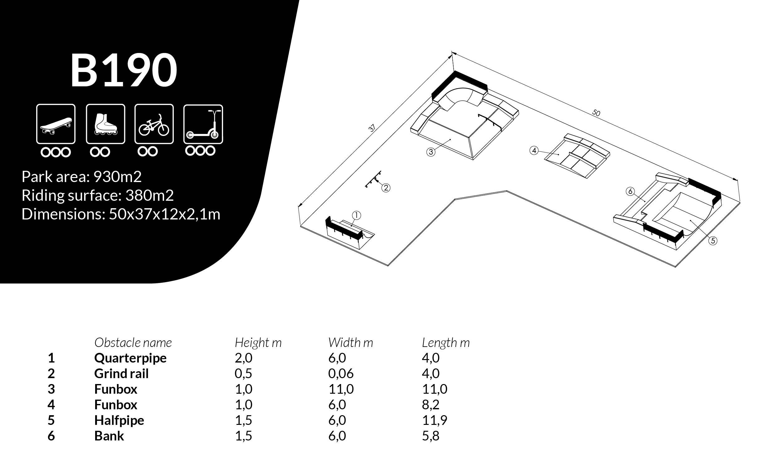 Skateboard Elin är utformad som skateparklösning för skateparker och offentliga aktivitetsytor. Mått: L 37 m, B 50 m, H 2 m.