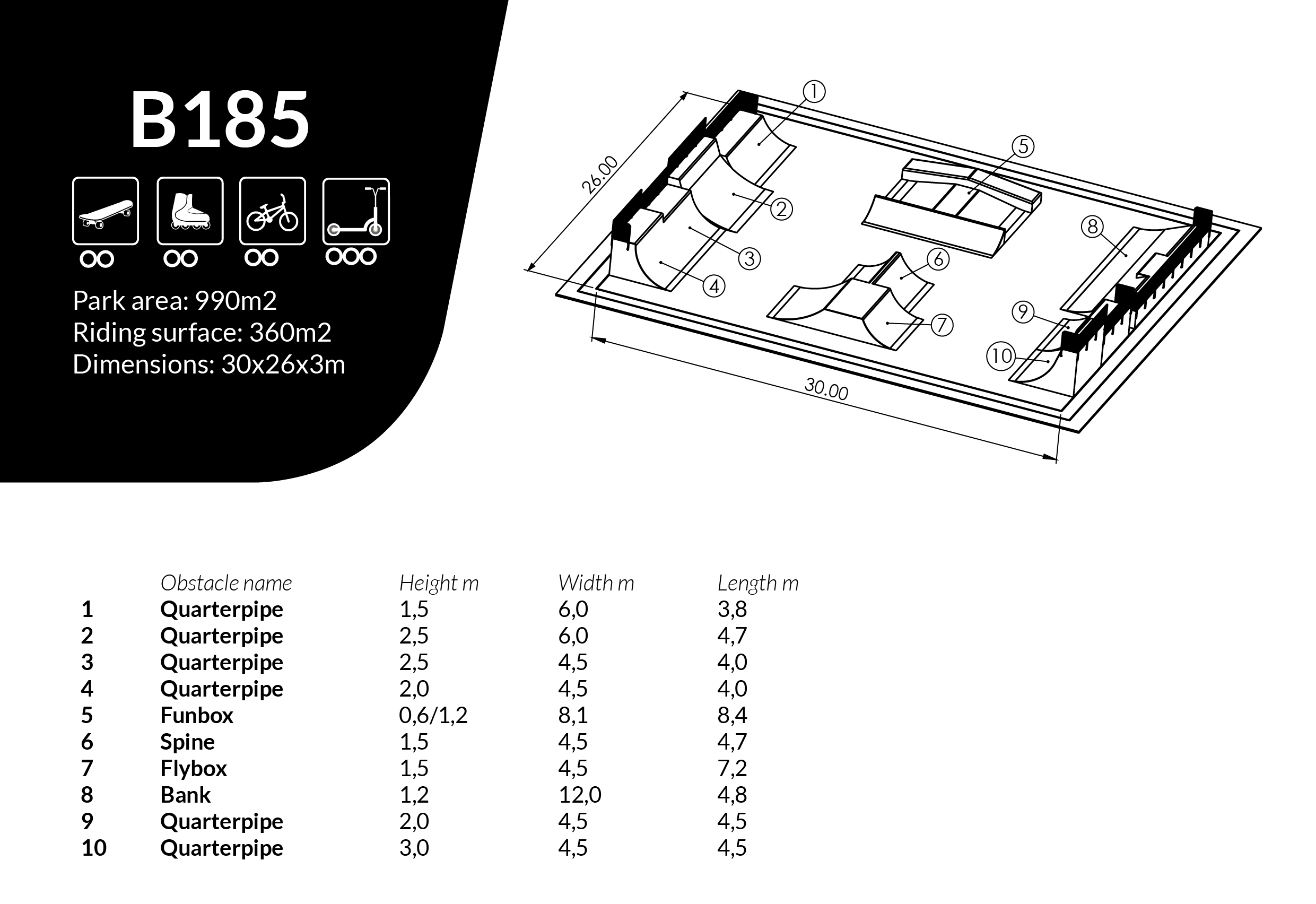 Skateboard Ella är utformad som skateparklösning för skateparker och offentliga aktivitetsytor. Mått: L 26 m, B 30 m, H 3 m.
