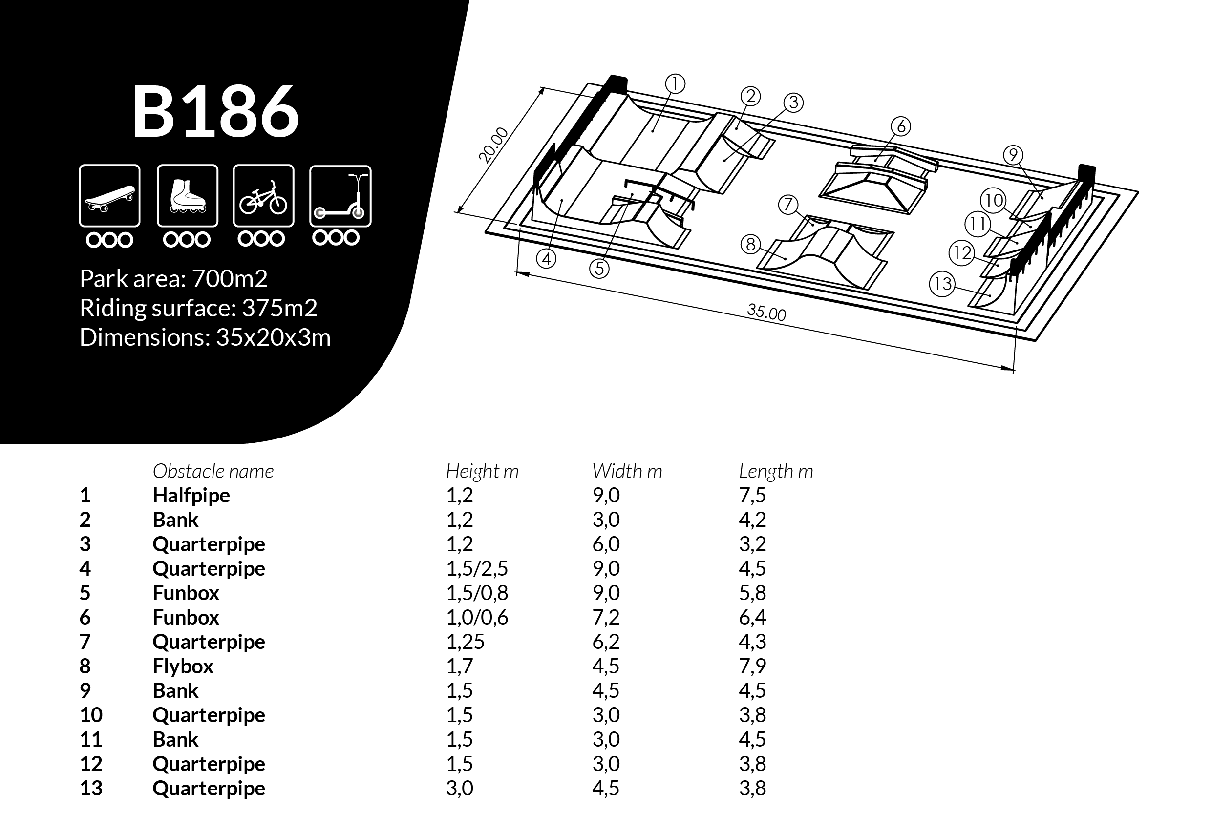 Skateboard Ester är utvecklad för offentlig skateanläggning och används i skateparksmiljö. Modellen fungerar som skateparklösning i linjer och kombinationer där man vill skapa ett säkert och varierat åkflöde för flera nivåer av åkare. Konstruktionen är avsedd för utomhusbruk med fokus på hållbarhet, funktion och stabil drift vid hög belastning. Produktmått: L 20 m, B 35 m, H 3 m.