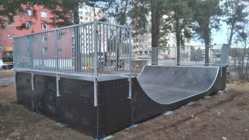 Skateboard Karin är utformad som miniramp för skateparker och offentliga aktivitetsytor. Mått: L 3,6 m, B 9,4 m, H 1,5 m.