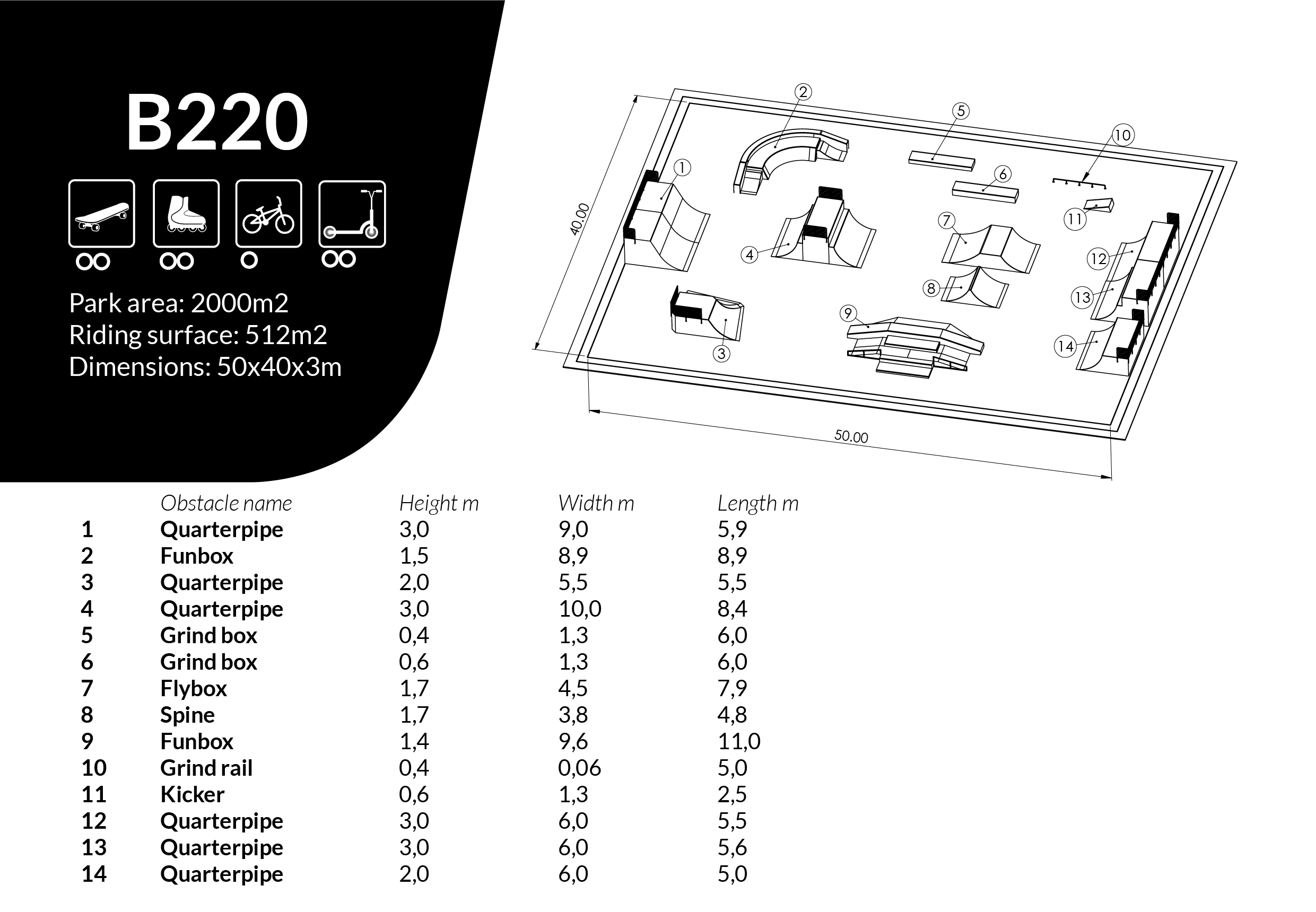 Skateboard Lina är utformad som skateparklösning för skateparker och offentliga aktivitetsytor. Mått: L 40 m, B 50 m, H 3 m.
