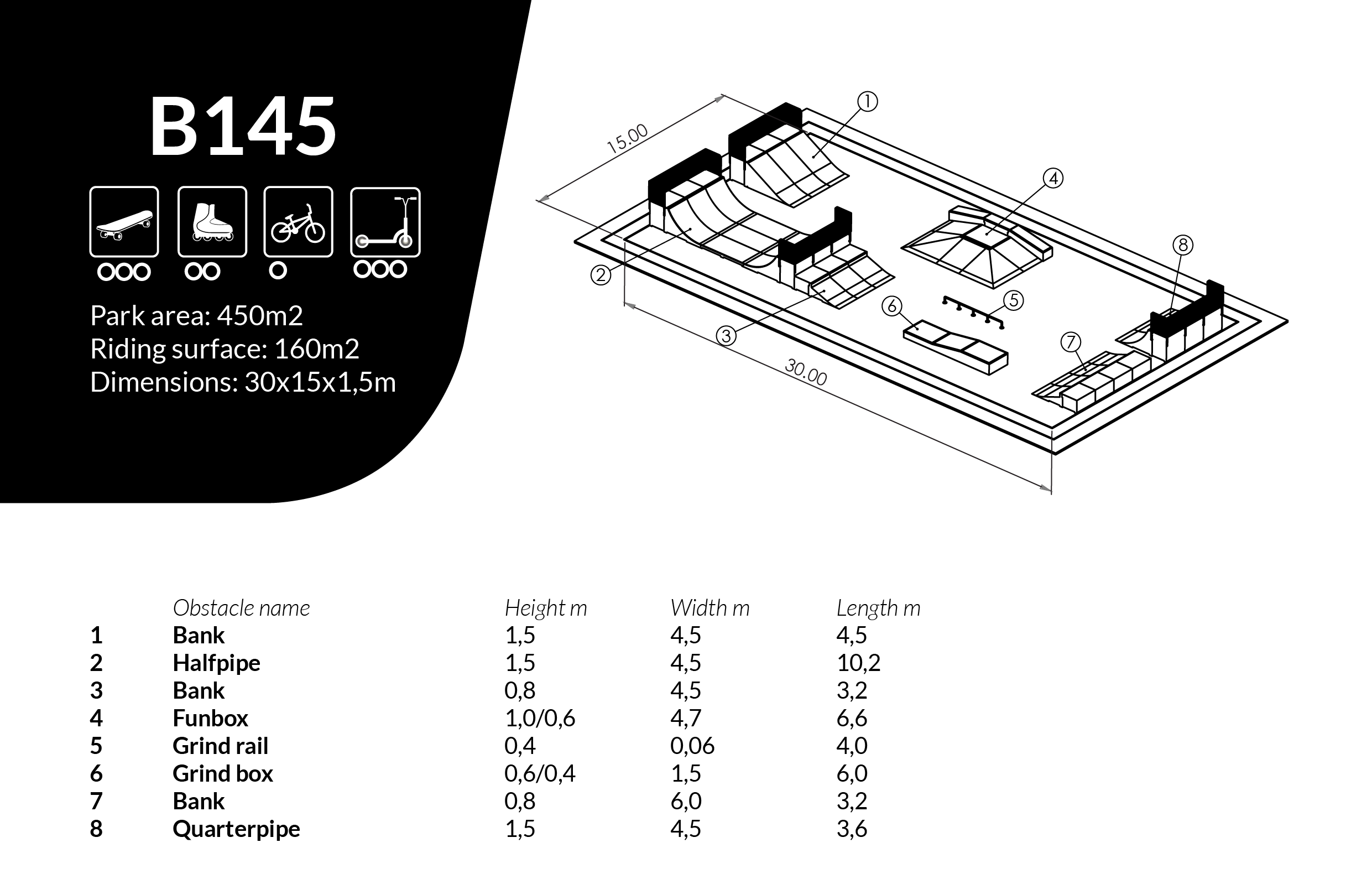 Skateboard Selma är utvecklad för offentlig skateanläggning och används i skateparksmiljö. Modellen fungerar som skateparklösning i linjer och kombinationer där man vill skapa ett säkert och varierat åkflöde för flera nivåer av åkare. Konstruktionen är avsedd för utomhusbruk med fokus på hållbarhet, funktion och stabil drift vid hög belastning. Produktmått: L 15 m, B 30 m, H 1,5 m.