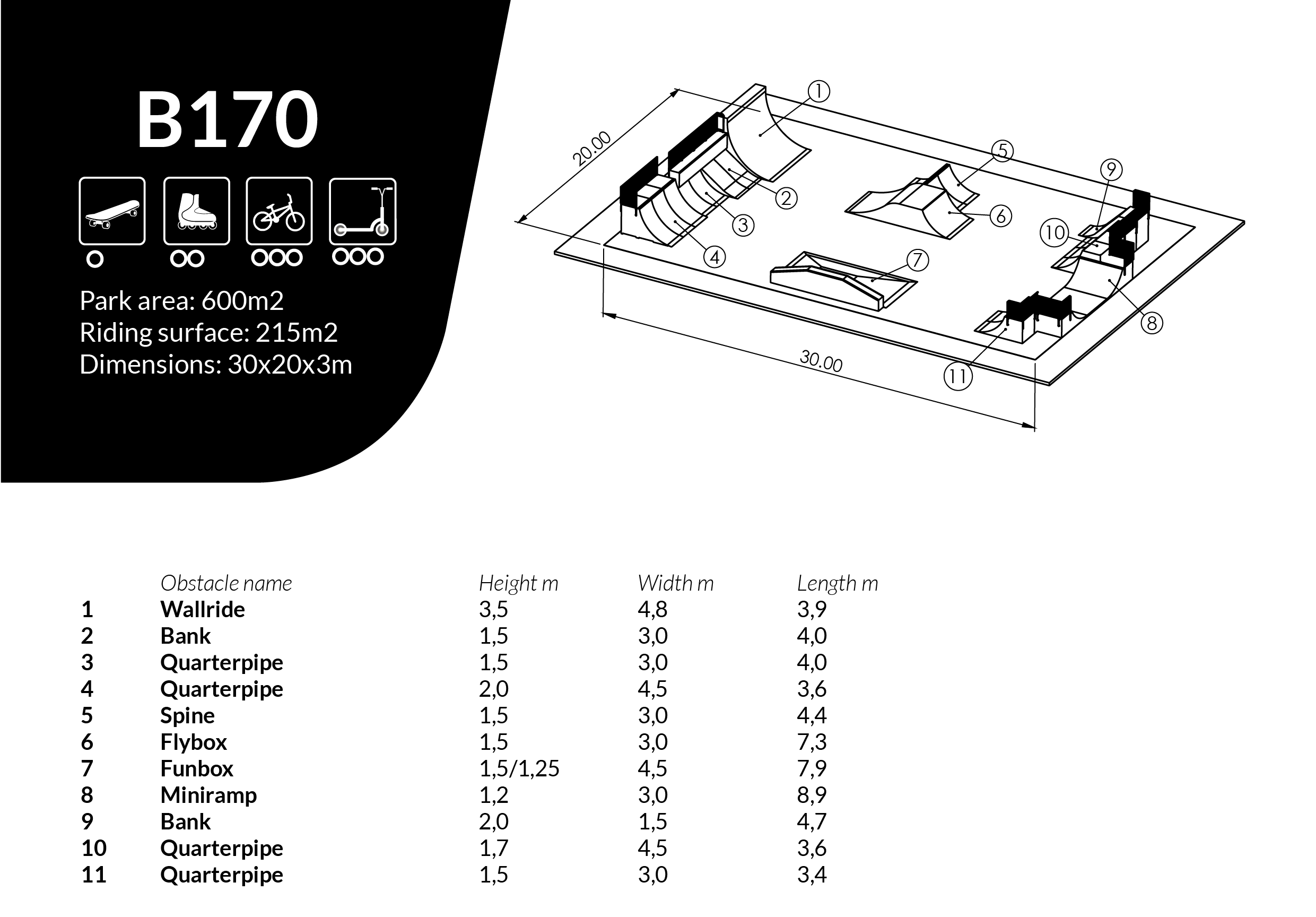 Skateboard Stella är utformad som skateparklösning för skateparker och offentliga aktivitetsytor. Mått: L 20 m, B 30 m, H 3,5 m.
