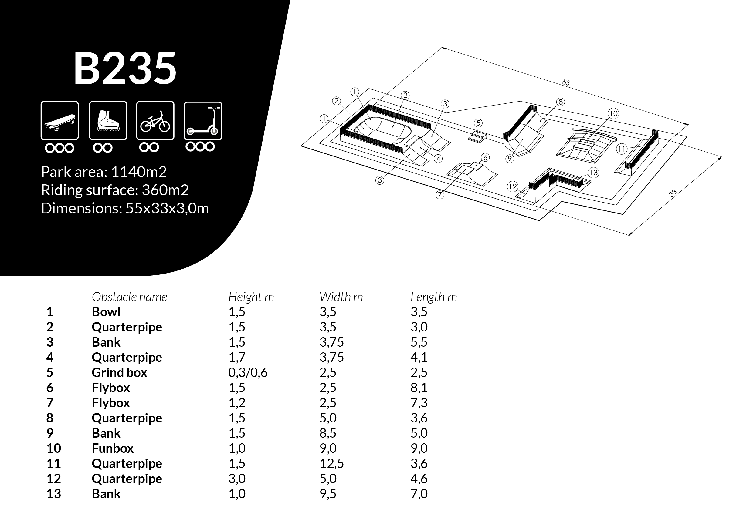 Skateboard Tilda är utvecklad för offentlig skateanläggning och används i skateparksmiljö. Modellen fungerar som skateparklösning i linjer och kombinationer där man vill skapa ett säkert och varierat åkflöde för flera nivåer av åkare. Konstruktionen är avsedd för utomhusbruk med fokus på hållbarhet, funktion och stabil drift vid hög belastning. Produktmått: L 33 m, B 55 m, H 3 m.