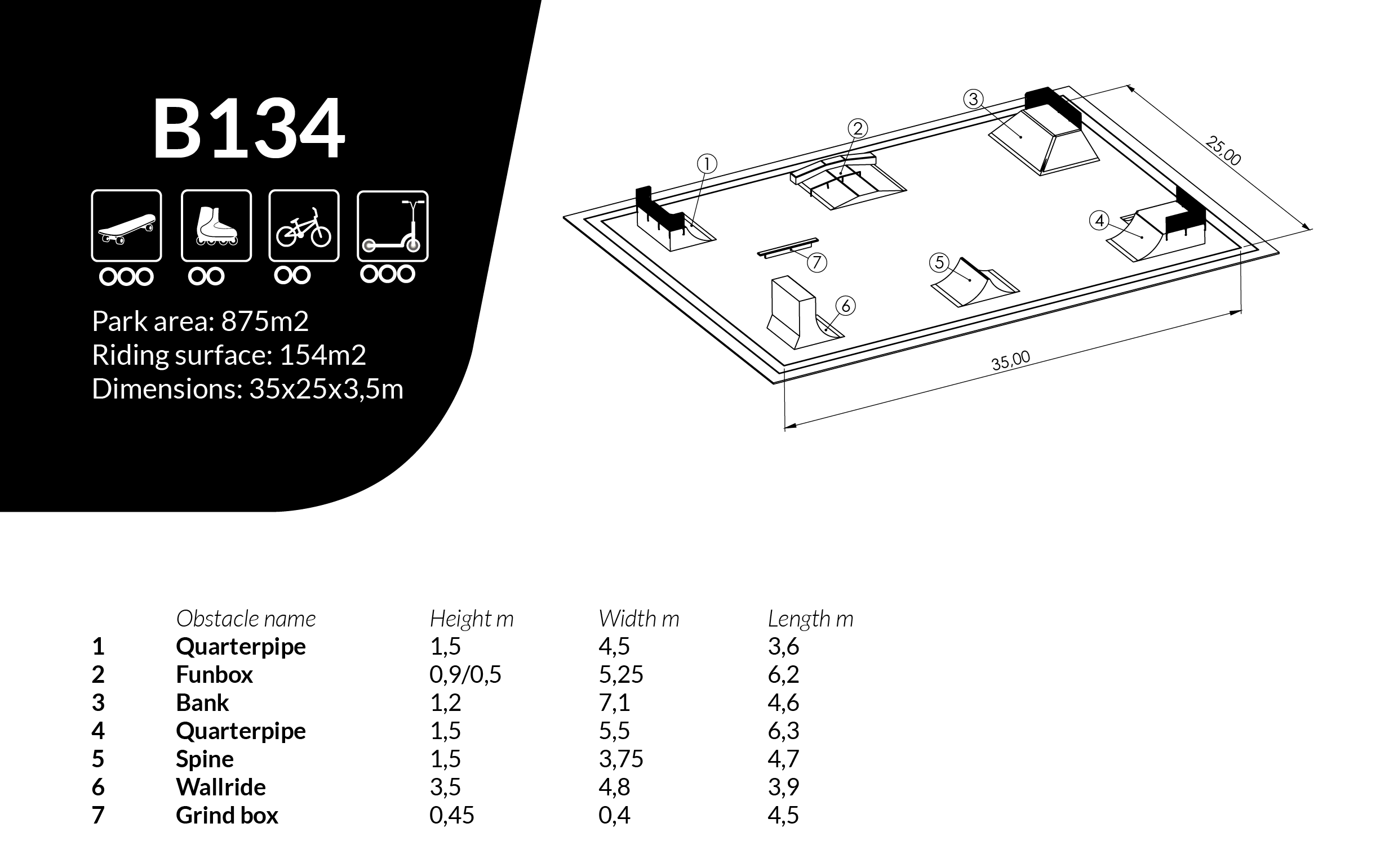 Skateboard Ulrika är utvecklad för offentlig skateanläggning och används i skateparksmiljö. Modellen fungerar som skateparklösning i linjer och kombinationer där man vill skapa ett säkert och varierat åkflöde för flera nivåer av åkare. Konstruktionen är avsedd för utomhusbruk med fokus på hållbarhet, funktion och stabil drift vid hög belastning. Produktmått: L 25 m, B 35 m, H 3,5 m.