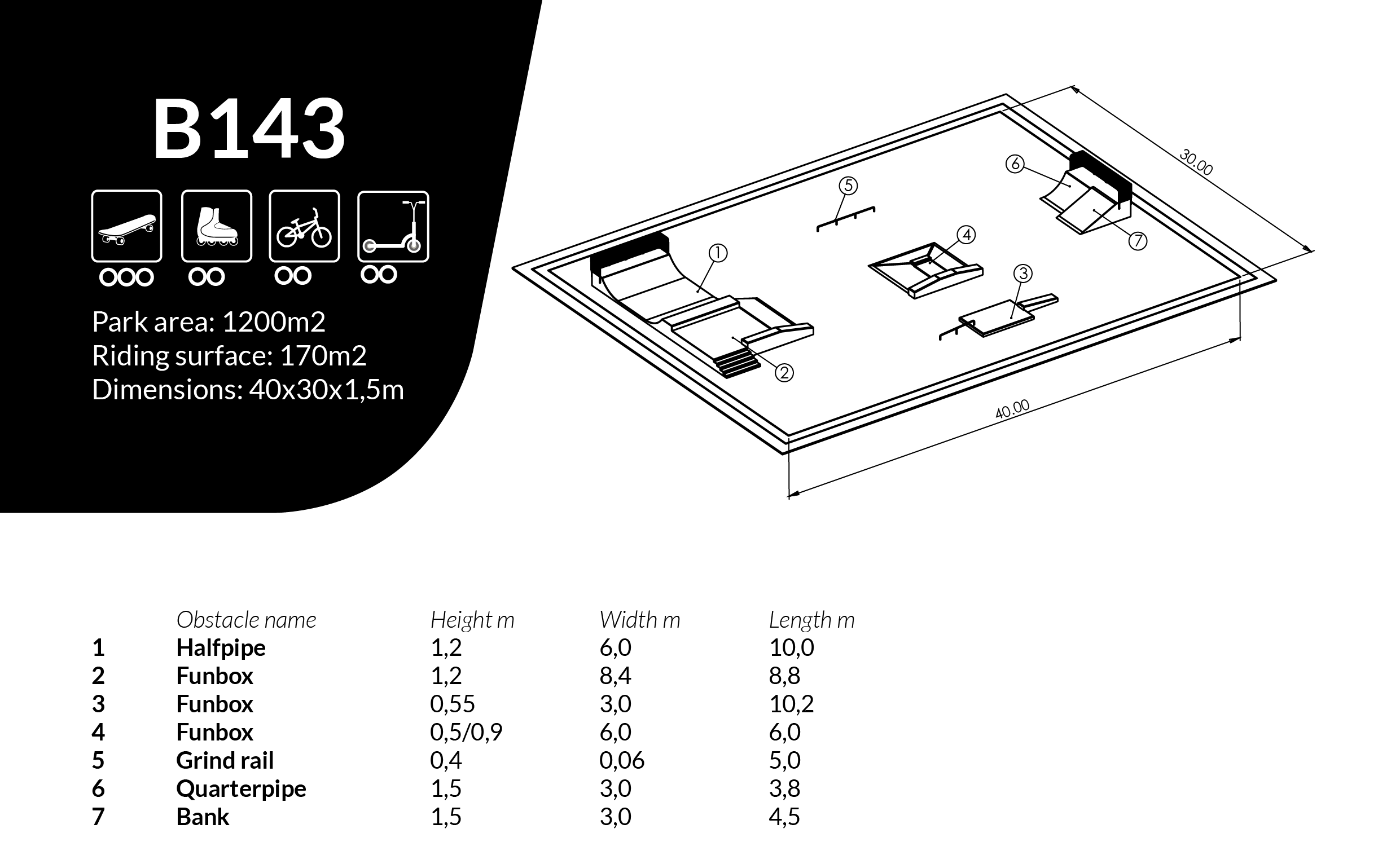 Skateboard Ylva är utvecklad för offentlig skateanläggning och används i skateparksmiljö. Modellen fungerar som skateparklösning i linjer och kombinationer där man vill skapa ett säkert och varierat åkflöde för flera nivåer av åkare. Konstruktionen är avsedd för utomhusbruk med fokus på hållbarhet, funktion och stabil drift vid hög belastning. Produktmått: L 30 m, B 40 m, H 1,5 m.