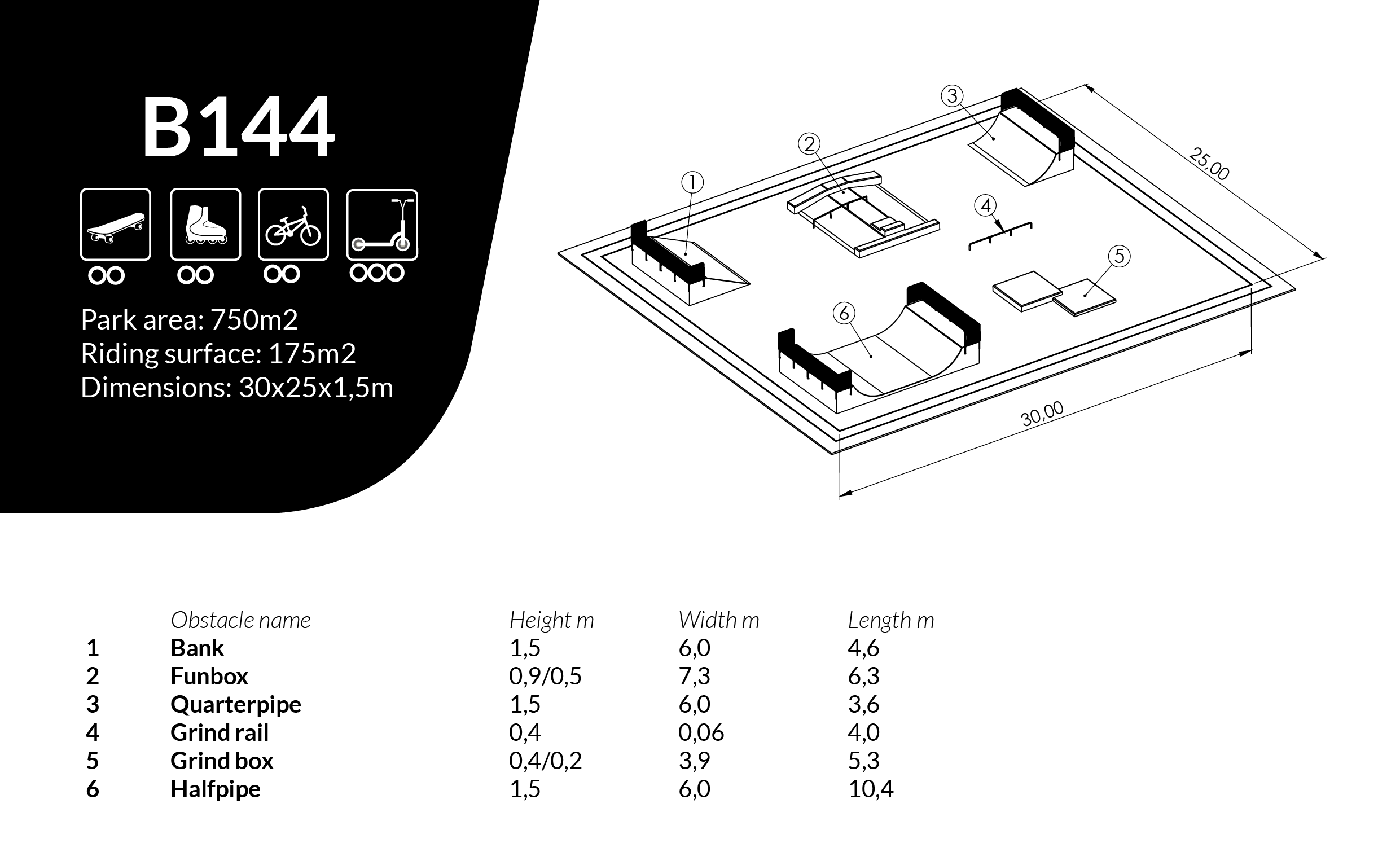 Skateboard Zandra är utformad som skateparklösning för skateparker och offentliga aktivitetsytor. Mått: L 25 m, B 30 m, H 1,5 m.