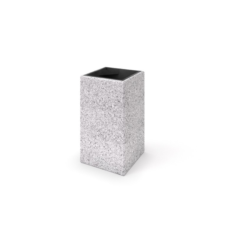 Fyrkantig soptunna i betong med invändig hink av galvaniserad stålplåt och askkopp. Finns i 6 färger. Möjlighet till text/kommunvapen.