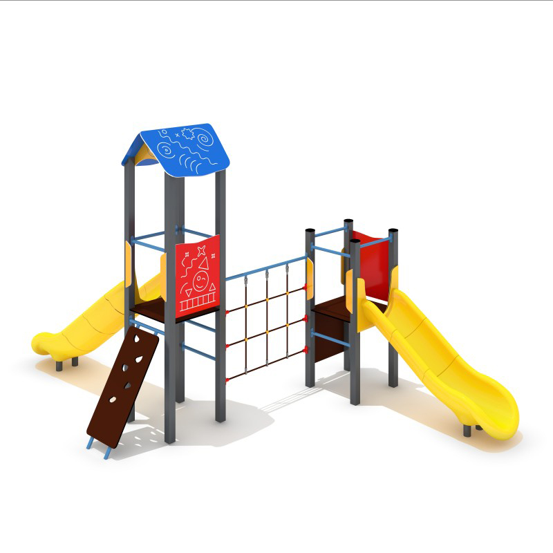 Tvåtorns lekställning med två rutschbanor, två klätterväggar och ett klätternät för barn i åldern 3–6 år. Setet har livliga färger och fingermönster som uppmuntrar barn att leka och utforska. Konstruktionen är tillverkad av svart stål som är skyddat mot korrosion och anpassat för väder och intensiv användning. Plattformarna är tillverkade av halkfri HPL som ger ökad säkerhet året runt.