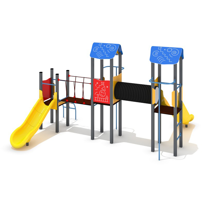 Lekställning med tre torn, två rutschbanor, en tunnel och en repbro för barn i åldern 3–6 år. Setet har livliga färger och fingermönster som stimulerar lek och upptäckande. Konstruktionen är tillverkad av svart stål som är skyddat mot korrosion och klarar intensiv användning i alla väder. Plattformarna är tillverkade av halkfri HPL för ökad säkerhet året runt.