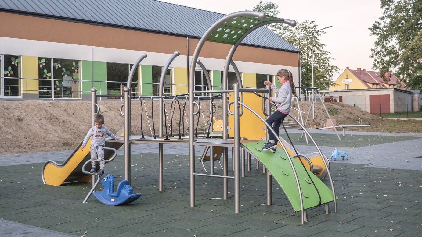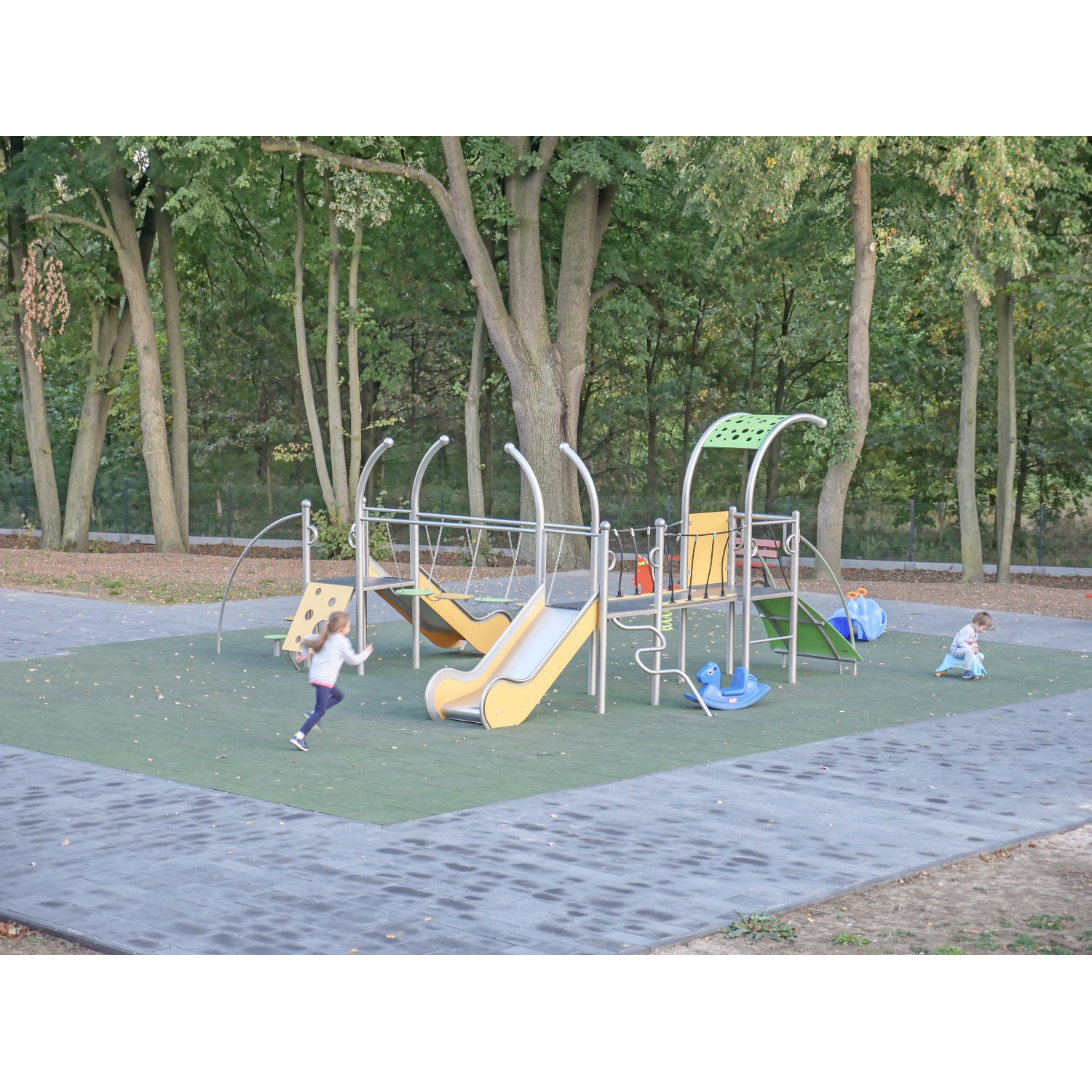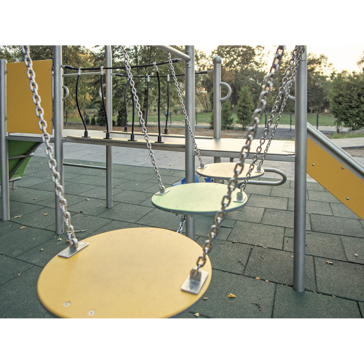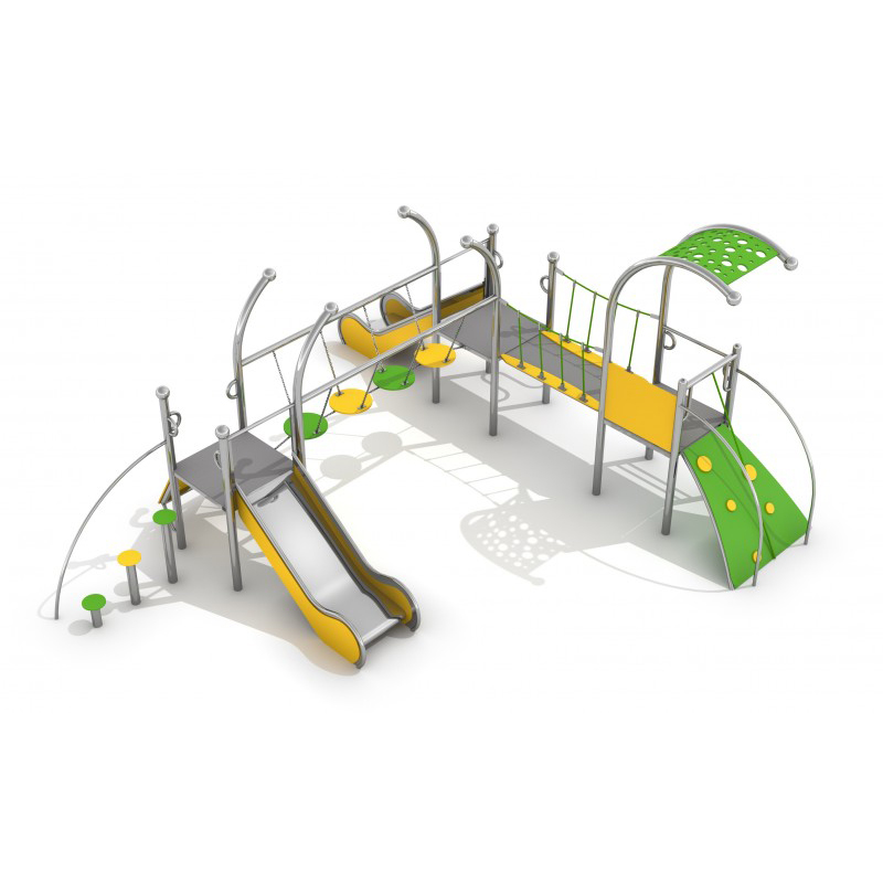 Lekset med tre torn i L-form, två rutschkanor och broar. Tillverkat av svetsad rostfri stålkonstruktion utan klämmor. Golvet är av halkfri HPL och väggar samt tak är tillverkade av HDPE. Uppfyller EN 1176.