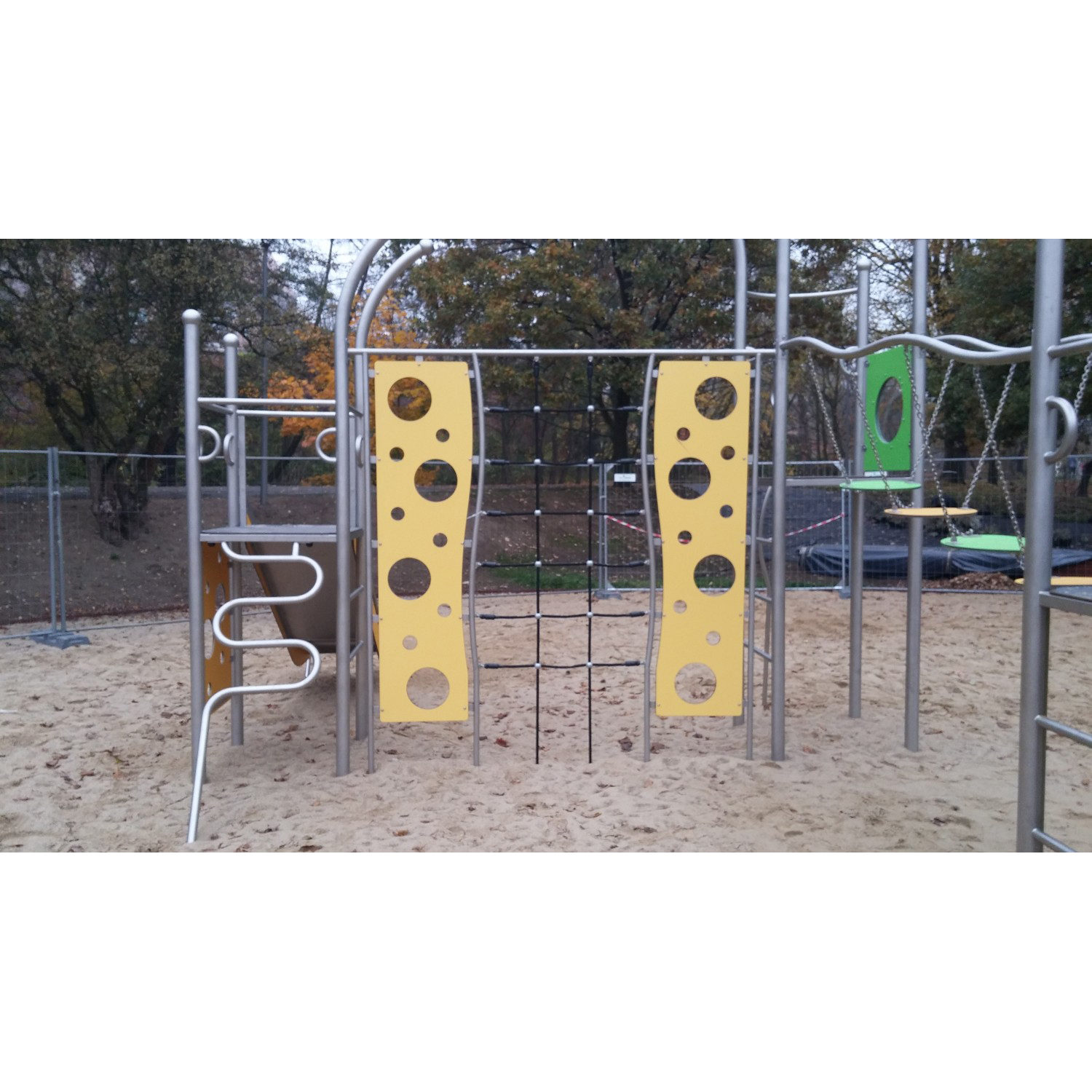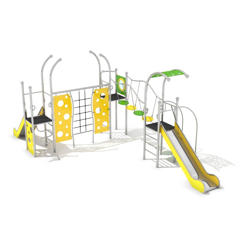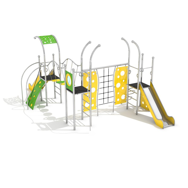 Konstruktion Gjord av rostfritt stål. Slides och banistersthe slides Gjord av rostfritt stål. Platforms Gjord av HPL material. Roof, entrance ramp, sidesthe slides, climbing walls, wheelsthe bridge, panel Gjord av HDPE material.