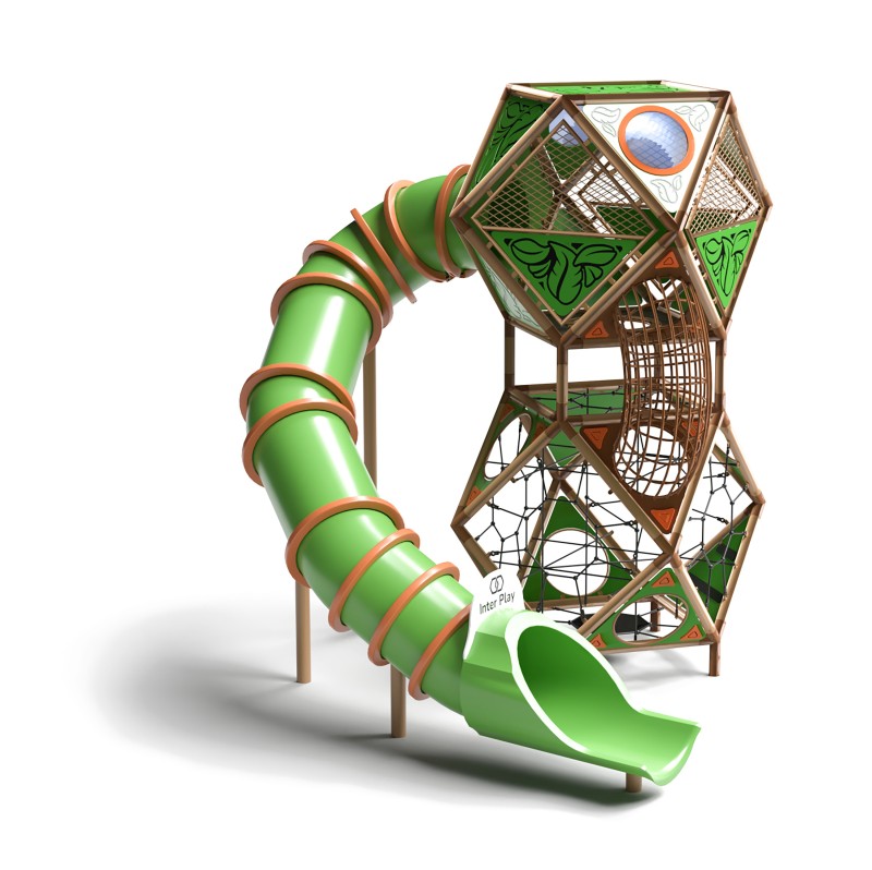 Lekset bestående av två sammankopplade sfäriska moduler och böjd rörformad rutschbana. Konstruktionen är uppbyggd av varmförzinkade och pulverlackerade stålrör Ø 88,9 mm. Stabil struktur för upp till 19 barn. Valbar version med rutschbanor i rostfritt stål.