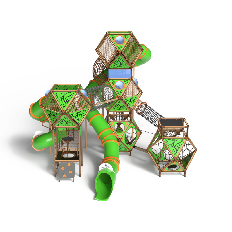 Lekset med fem sammankopplade sfäriska moduler och två långa rörslider. Konstruktion i varmförzinkat och pulverlackerat stål. Dimensionerat för samtidig lek av över 70 barn.