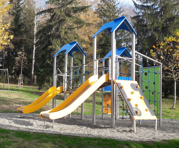 Populärt och välutrustat lekset med tre hus, broar och dubbla rutschkanor. Erbjuder många lekmöjligheter som passar både yngre och äldre barn.
